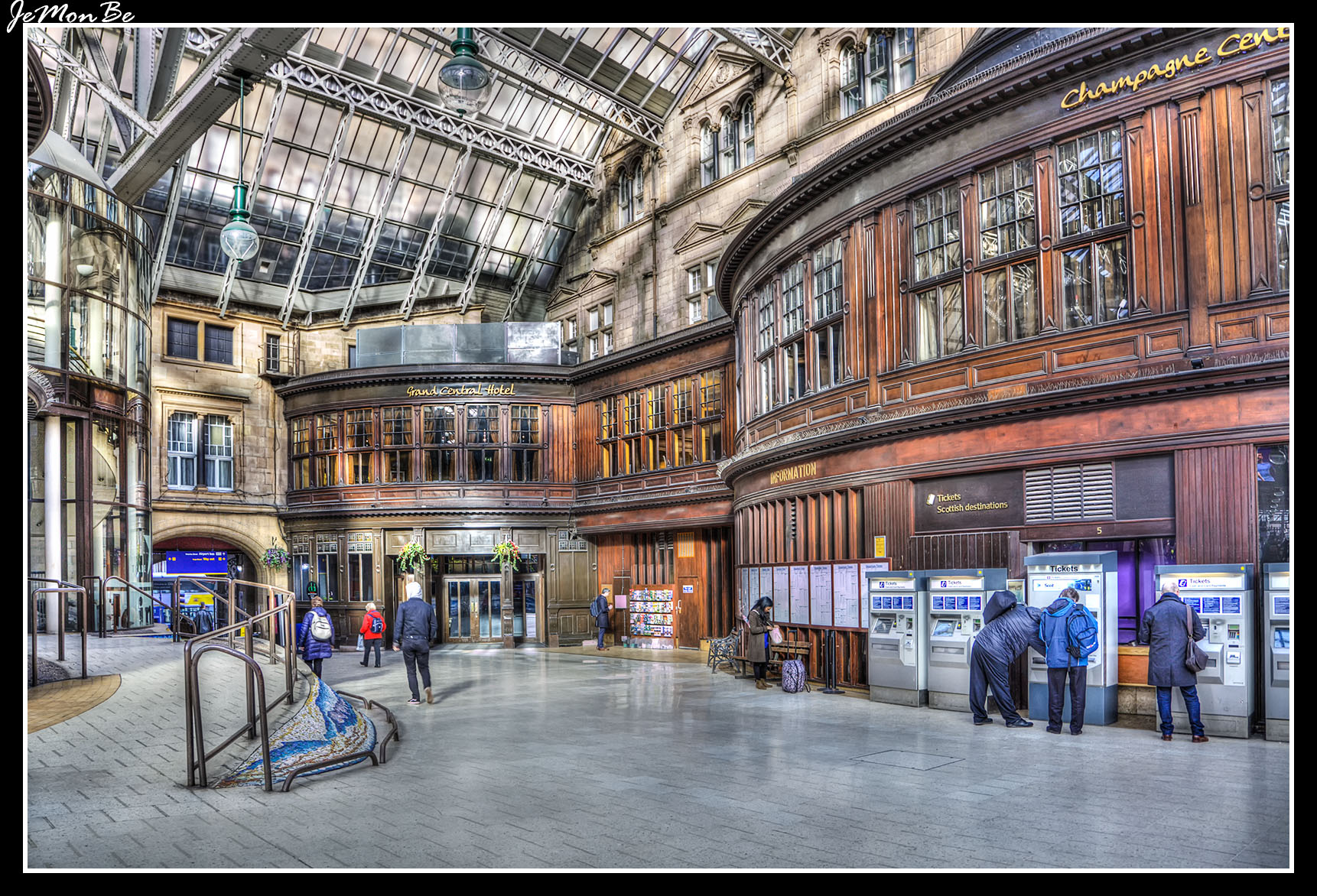 La gran zona de espera tiene un aspecto muy solemne con comercios laterales todos ellos construidos con maderas de tonos oscuros, muy a tono con el porte exterior del edificio.