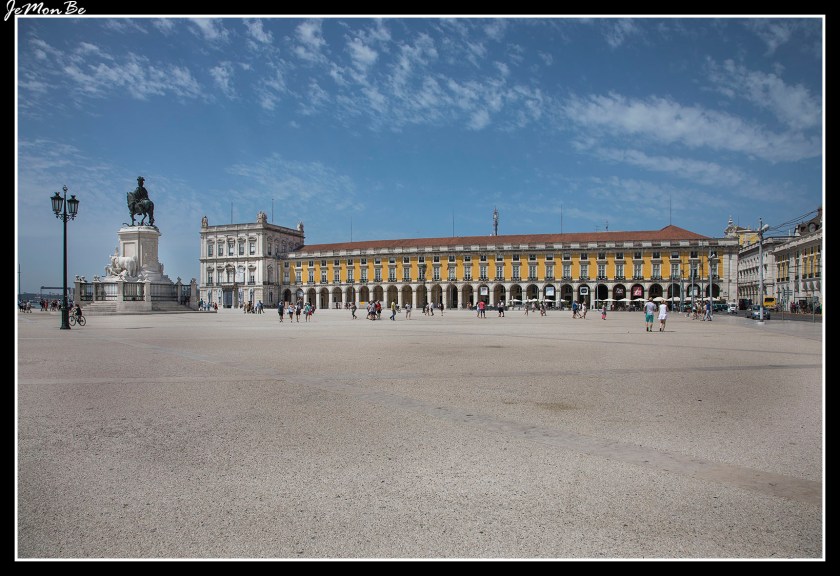 La fisionomía de la Plaza del Comercio se compone de un conjunto de edificios porticados en tres de sus lados y está abierta en el lado sur, mirando al Tajo. Históricamente ahí llegaban los barcos mercantes y ésta era la puerta de Lisboa.