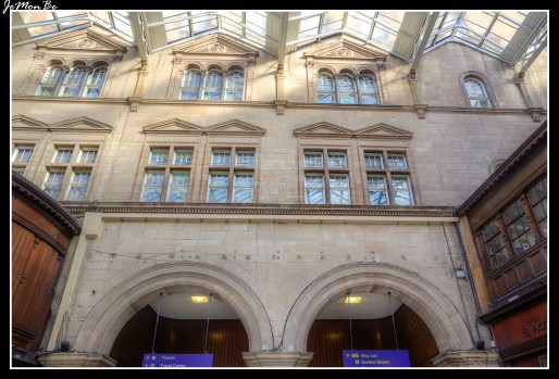 La gran zona de espera tiene un aspecto muy solemne con comercios laterales todos ellos construidos con maderas de tonos oscuros, muy a tono con el porte exterior del edificio.