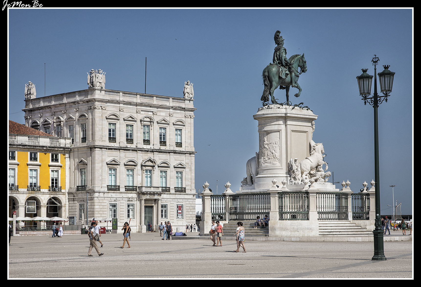 La fisionomía de la Plaza del Comercio se compone de un conjunto de edificios porticados en tres de sus lados y está abierta en el lado sur, mirando al Tajo. Históricamente ahí llegaban los barcos mercantes y ésta era la puerta de Lisboa.