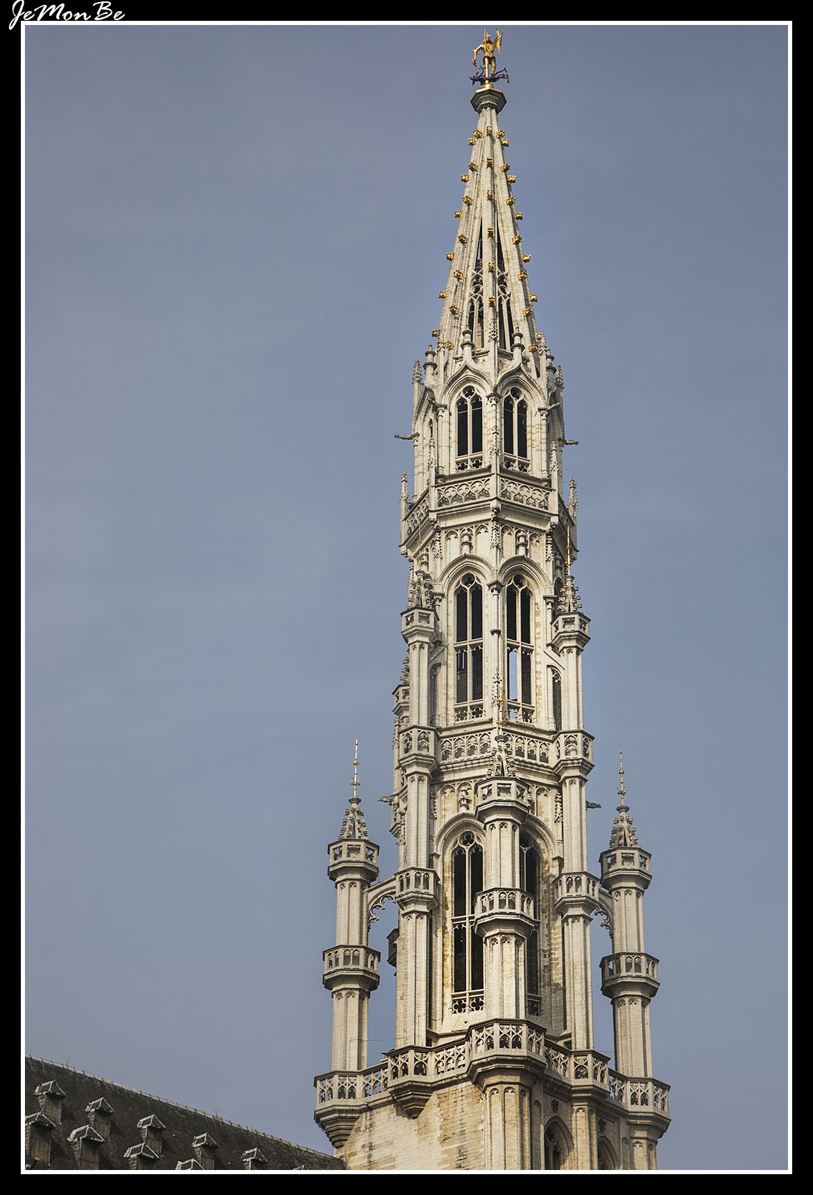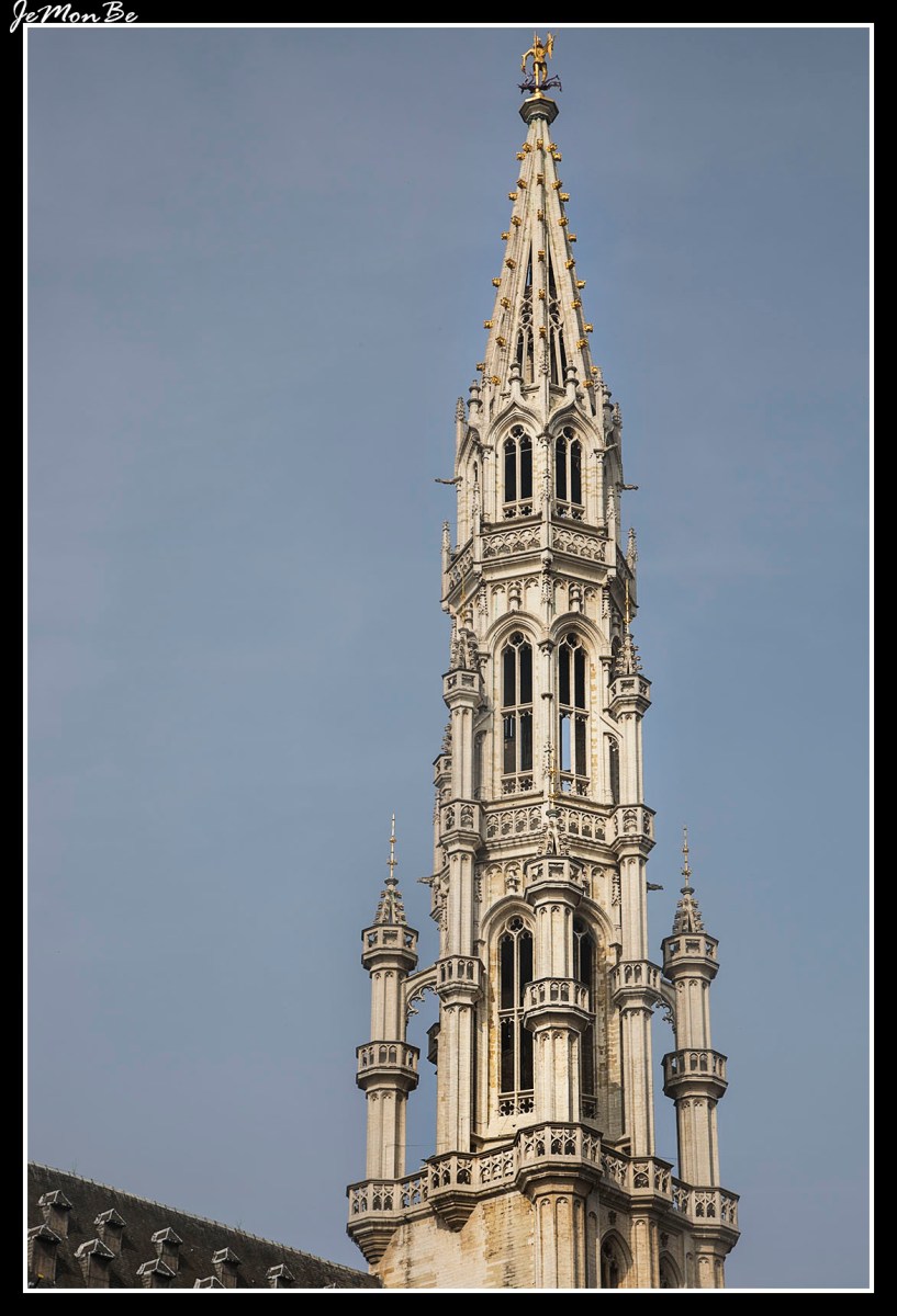 La torre de estilo gótico de 96 metros de altura tiene en su extremo una estatua del arcángel san Miguel, patrón de Bruselas, venciendo al Diablo.