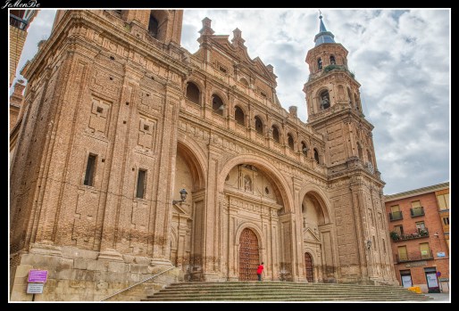 Compone el conjunto de la fachada un cuerpo bajo, donde se encuentran tres arcadas que cobijan las puertas, cuerpo central, con una galería de nueve arcos a modo de conjuntorio, y un remate a modo deimafronte. Todo ello jalonado por dos torres de 50 metros.