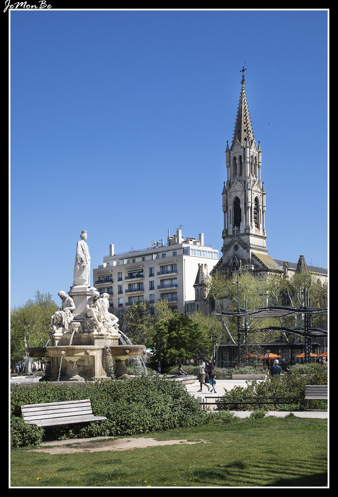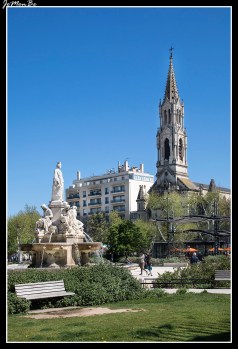 La explanada Charles de Gaulle es un espacio con una superficie total de 3 hectáreas. El elemento central es la fuente de Pradier, que representa en forma alegórica la ciudad de Nîmes, rodeada por cuatro ríos principales en la región de Nîmes. Al sur se encuentran bancos, jardines, plantas y árboles mediterráneos, así como pérgolas cubiertas de bambú. Varios quioscos, incluida una sucursal de la oficina de turismo, marcan el conjunto. Varios edificios importantes rodean la explanada: les Arènes al oeste, el palacio de justicia al norte o la iglesia Sainte-Perpétue y Sainte-Félicité al este.