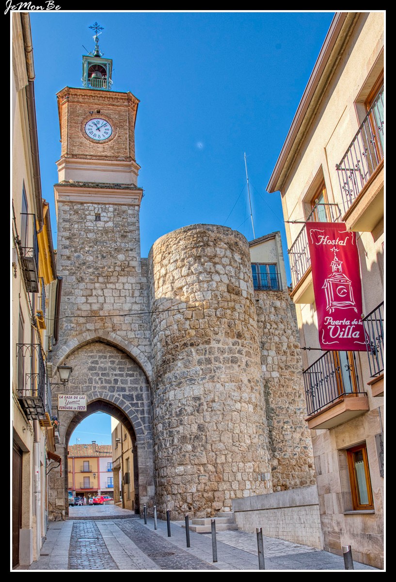 Dando paso a la Plaza Mayor de Almazán está la Puerta de la Villa que aparece flanqueada por torres cilíndricas con los arcos apuntados, conserva los huecos para las trancas del cierre de las puertas. A la Puerta de la Villa se le añadió la Torre del Reloj en 1886, pasando a conocerse también como la Puerta de la Torre del Reloj.