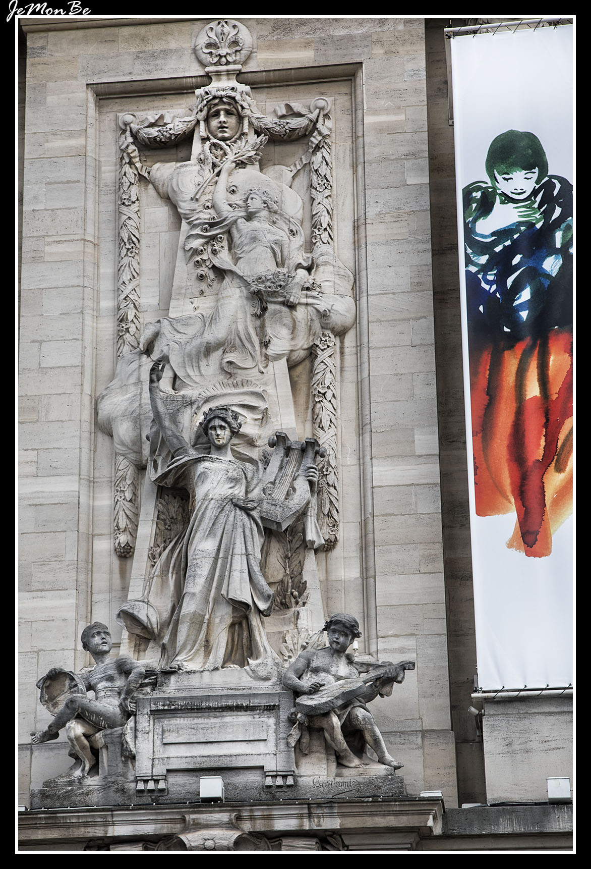 A la izquierda, una mujer joven con una lira, representa a La Musica. Los niños pequeños tocan la pandereta y la guitarra. A la derecha, el escultor Héctor Lemaire, simbolizó la tragedia. Los putti portan máscaras de teatro y la alegoría femenina dramática y animada blande una espada, rodeada de serpientes y relámpagos.