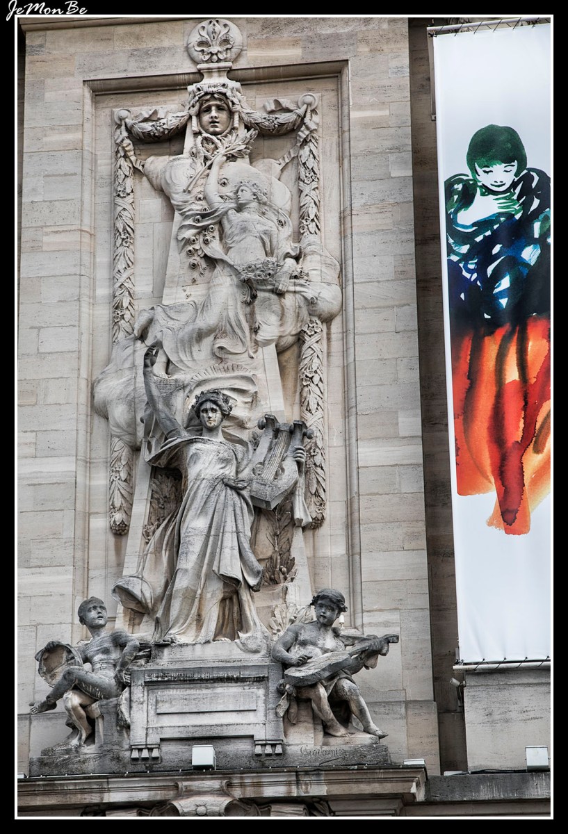 El frontón, ilustra la Glorificación de las Artes, el grupo tallado gira en torno a Apolo, el Dios de los Oráculos, las Artes y la Luz. Nuevas musas lo acompañan, reuniendo en torno a la alegoría del viento Zephyr, la poesía, la música, la comedia, la tragedia y otras artes líricas o científicas.