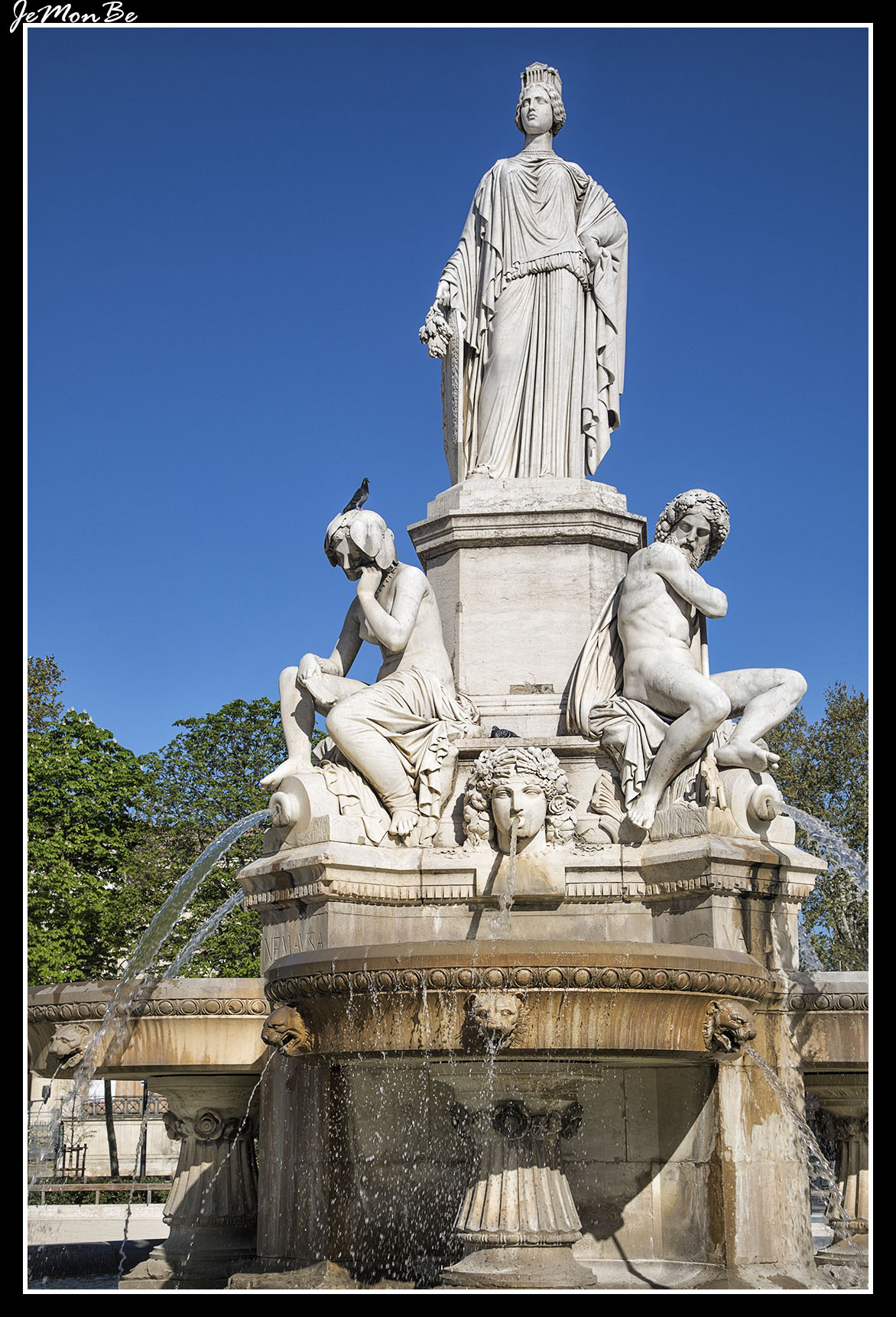 La fuente de Pradier es de mármol blanco. Su elemento principal, una mujer joven de pie, representa alegóricamente la ciudad de Nîmes. Lleva como corona los emblemáticos monumentos romanos de la ciudad: la plaza de toros y la columnata de la Maison Carrée.