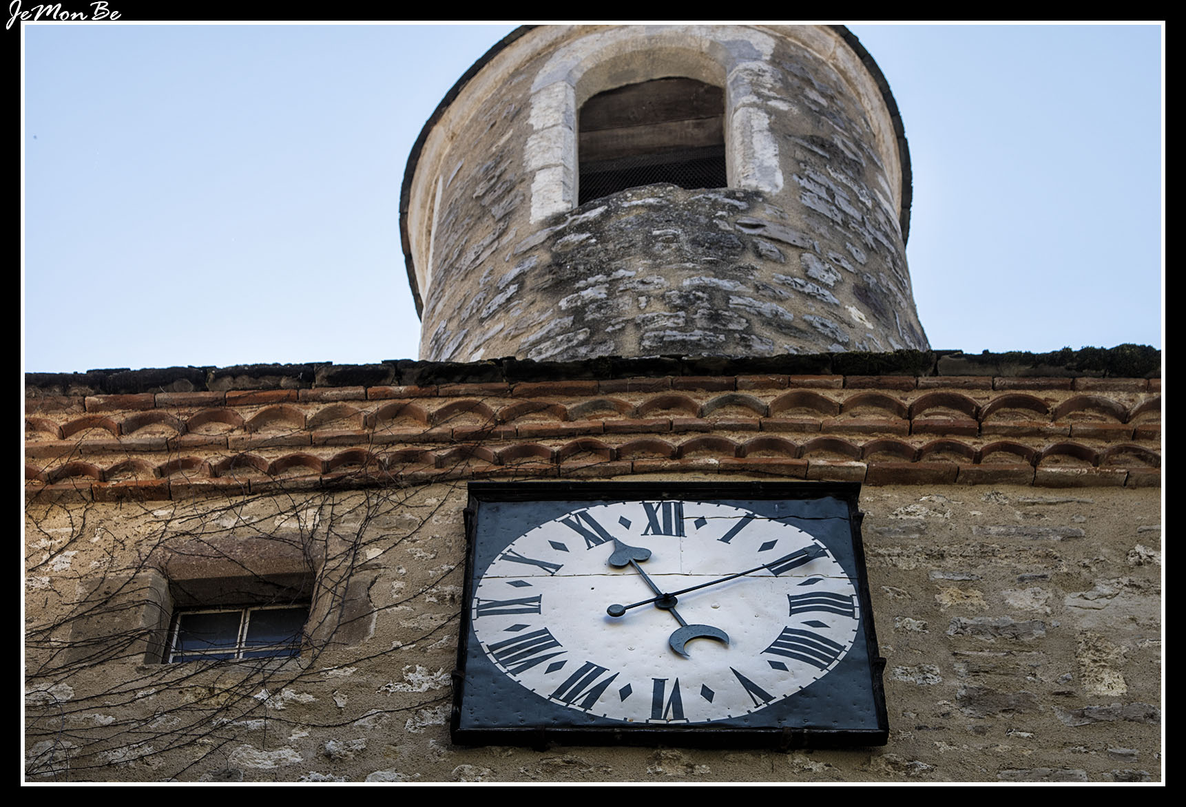 Construida en piedra calcárea, con planta rectilínea, destaca su arco de medio punto y el reloj justo debajo de una pequeña torre central.