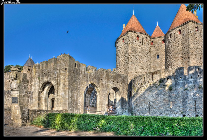 La entrada principal a la ciudad medieval de Carcasona es la Puerta de Narbona, orientada hacia la ciudad de la costa mediterránea que le da el nombre. Fue construida hacia 1280 durante el reinado de Felipe III de Francia y se compone de dos imponentes torres de tres niveles además de la planta baja, equipadas con un frente en forma de tajamar para el desvío de los proyectiles atacantes. La puerta de acceso está reforzada por un doble rastrillo y protegida por matacanes, desde donde se podían arrojar verticalmente objetos, y por troneras, para disparar proyectiles de manera protegida.