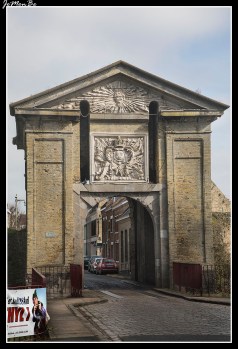 Imagen anterior Imagen siguiente 06 Bergues puerta de Cassel La puerta de Cassel, de aspecto muy clásico, data de la conquista francesa (1668). Es por eso que el sol radiante de Luis XIV aparece bajo el frontón triangular.