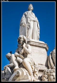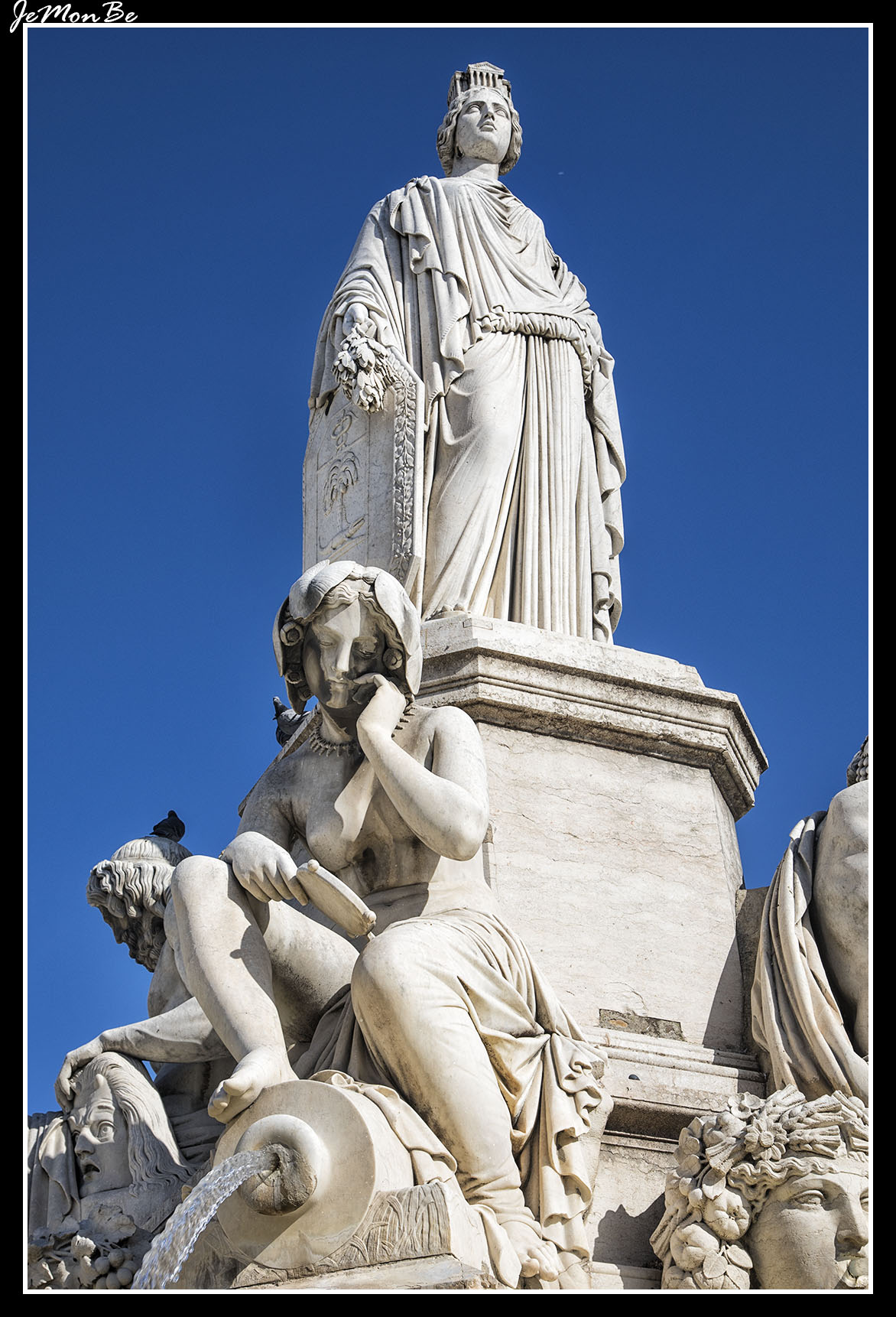 La estatua principal está rodeada por cuatro estatuas, cuyas cuencas recogen agua. Estos cuatro personajes, dos hombres y dos mujeres, representan cuatro ríos principales de la región de Nîmes: la Fuente de Nimes, fuente madre de la colonia romana, el Gardon, la Fuente de Eure y el Ródano . Cada una de estas representaciones se identifica por su nombre latino, grabado en su base: Nemausa, Vardo, Ura y Rhodan.