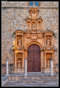 El acceso viene precedido por una escalinata con ocho columnas de mármol de estilo renacentista traídas desde Napolés por el Sexto Conde de Miranda, Juan de Zuñiga y rey de Napolés así como los tres bustos de los tres emperadores romanos que se hayan en la fachada.