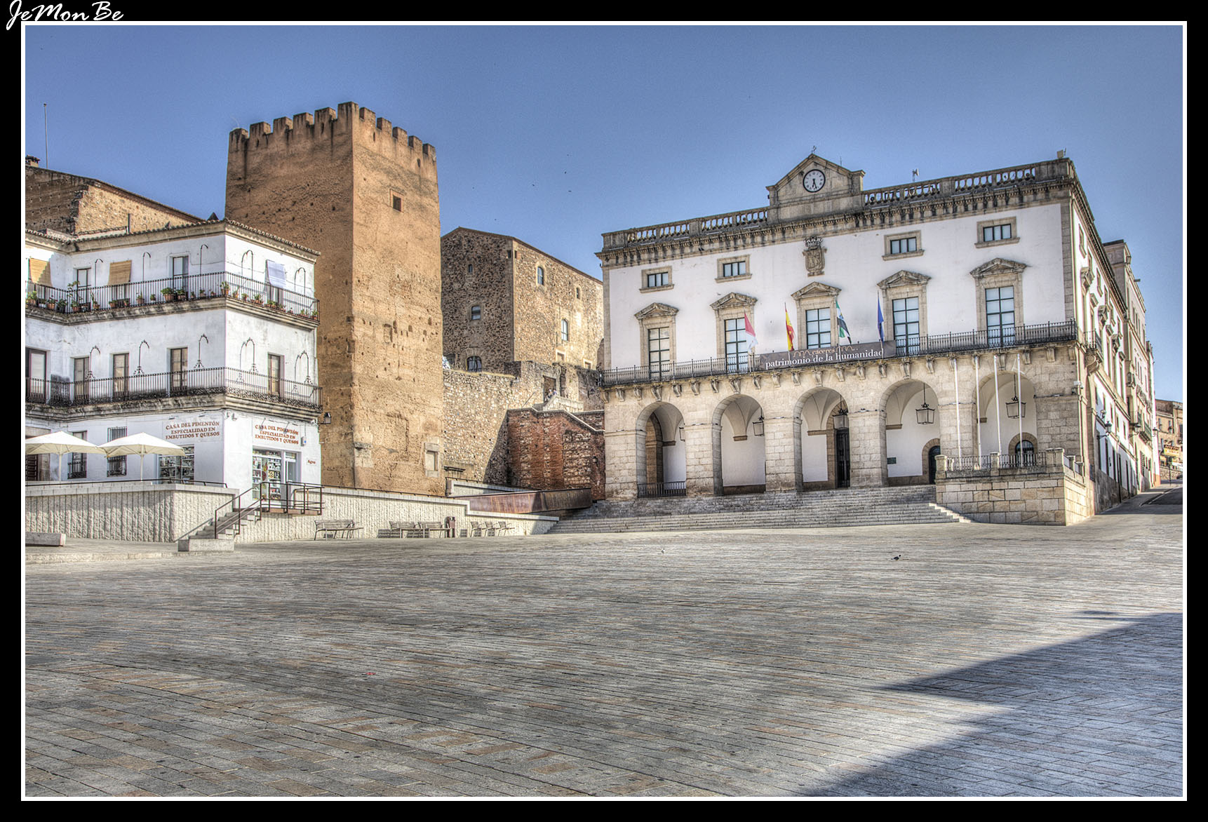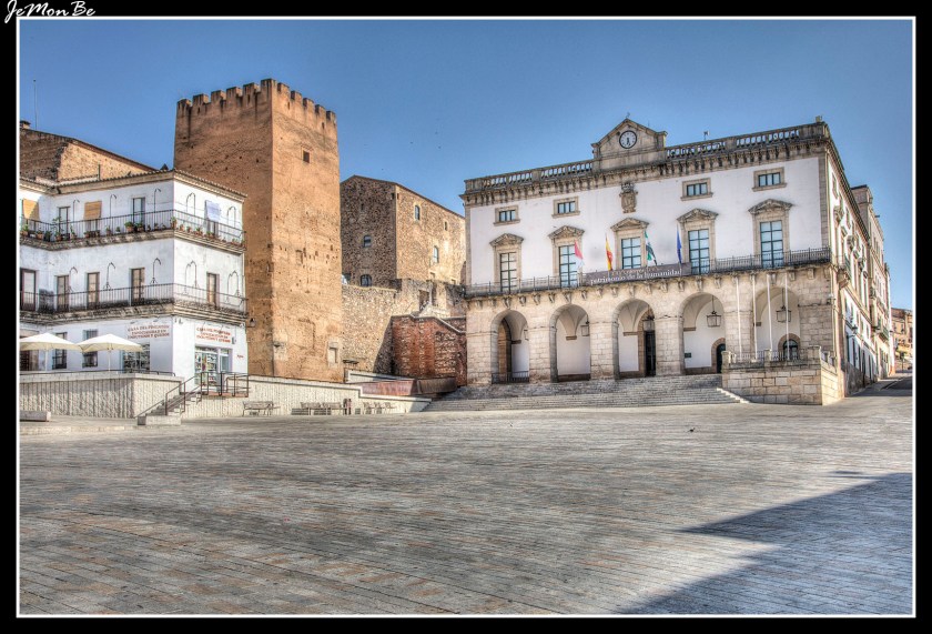 La Plaza Mayor a lo largo de la historia, ha tenido distintos usos y denominaciones: plaza de la feria, del mercado…, en muchas ocasiones se utilizó como coso taurino o para celebrar torneos, desfiles militares y procesiones de Semana Santa. Está rodeada de soportales y la preside el Ayuntamiento construido en 1869. En ella se pueden contemplar monumentos tan emblemáticos como la Torre de la Hierba, la de los Púlpitos y sobre todo la Torre de Bujaco junto a la Ermita de la Paz.