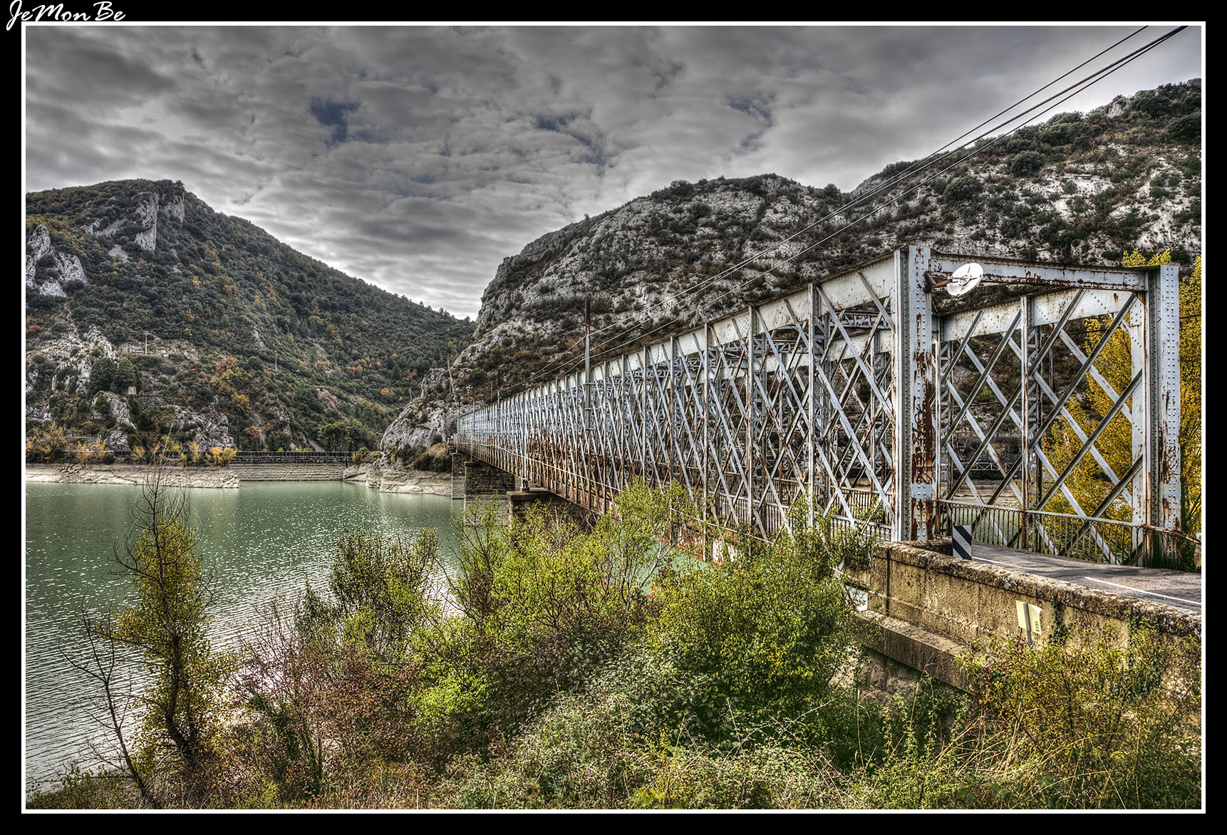 Llama la atención el puente que salva el vaso del embalse, para permitir el tráfico rodado, construido por Severino Bello siguiendo la arquitectura ferroviaria de la época y que tan sólo unos kilómetros más adelante, en La Peña Estación, se repite pero en esta ocasión para permitir al ferrocarril, el mítico ‘Canfranero’ salvar el cauce hacia (o desde) Riglos.
