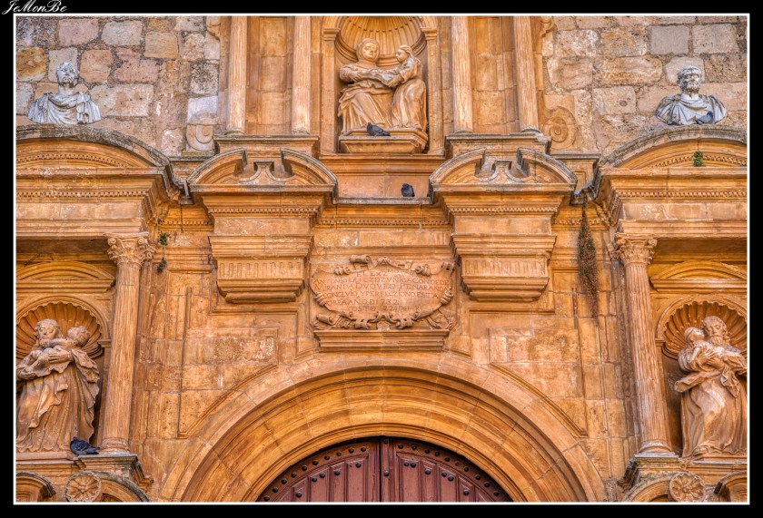 El acceso viene precedido por una escalinata con ocho columnas de mármol de estilo renacentista traídas desde Napolés por el Sexto Conde de Miranda, Juan de Zuñiga y rey de Napolés así como los tres bustos de los tres emperadores romanos que se hayan en la fachada.