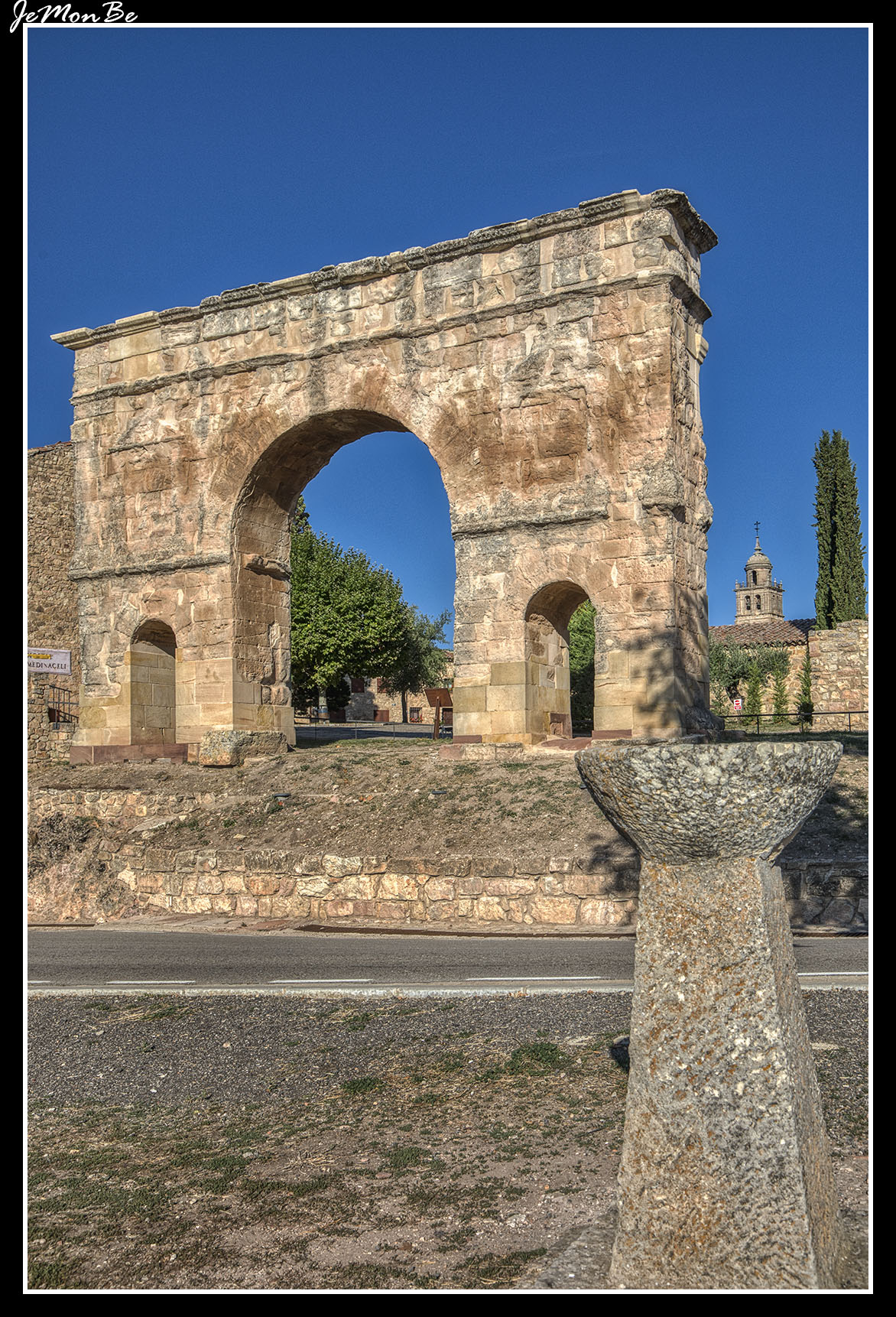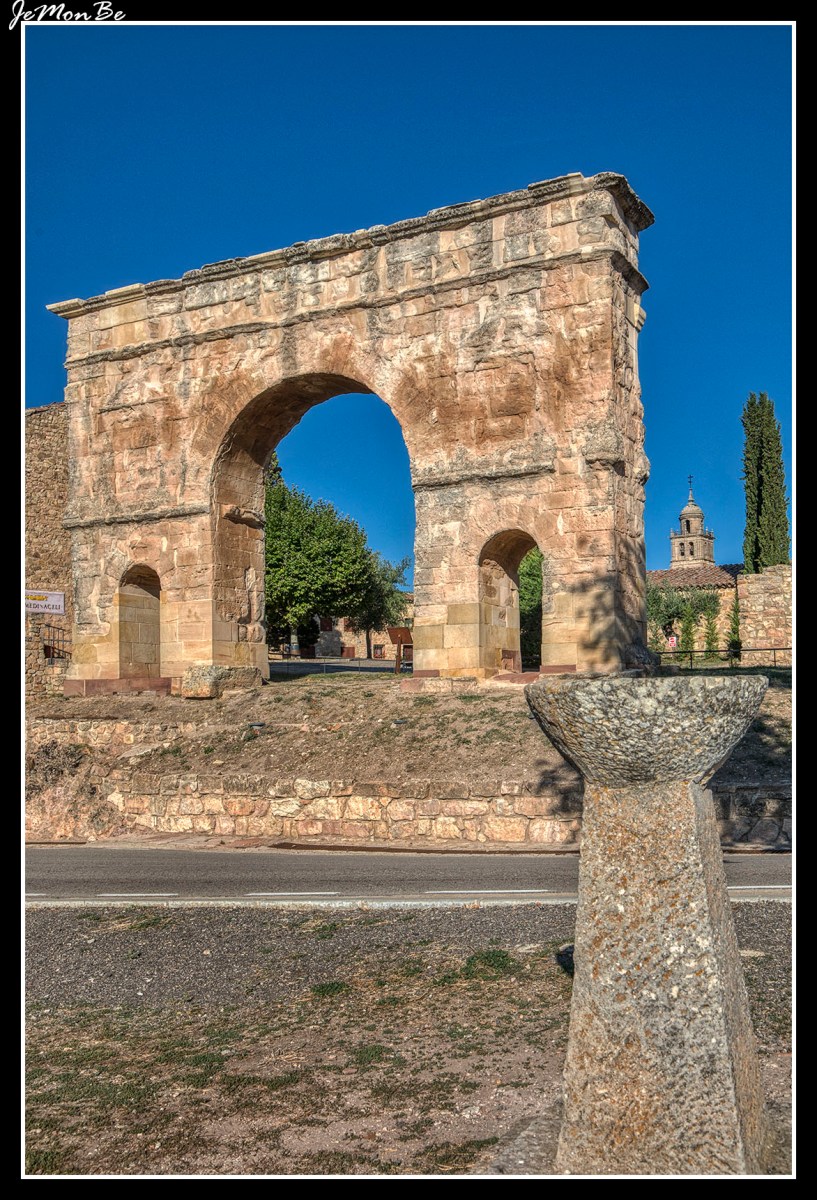 El arco romano de Medinacelli es el único arco romano de triple arquería que se conserva en España. Sigue el modelo del arco de Trajano y presenta una decoración muy simple pero efectiva. Su conservación es aceptable salvo su decoración que está muy desgastada debido a la situación geográfica en la que se encuentra. Su fábrica es de Opus Quadratum de tamaño variable, colocados a soga y algunos a tizón. Sobre ellos se labraron todos los elementos decorativos. El tamaño del conjunto mide 13’20 m. de largo, 2’10 m. de ancho y 8’10 m. de altura. Servía, además de su función conmemorativa, de puerta de acceso a la ciudad. El arco central era paso de carruajes y animales y los laterales de los peatones.