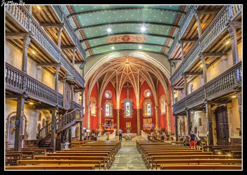 El campanario tiene una altura de 45m y en su fachada presenta un cuadrante solar con la inscripción siguiente en latín: “Vulnerant omnes, ultima necat” que puede traducirse como “todas las horas hieren, la última mata”. El interior de la iglesia es el típico de las iglesias del País Vasco con sus tres pisos de galerías a los que por tradición sólo los hombres podían acceder.