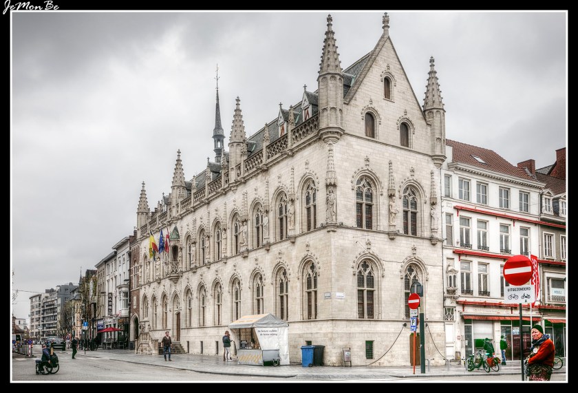 El Historisch Stadhuis, edificio gótico flamígero de 1421. Presenta una elaborada fachada con agujas de piedra y estatuas en hornacinas. En las vidrieras se ve esculpido el escudo de la ciudad y los trabajadores del principal gremio textil que existió en Kortrijk en el siglo XIII.
