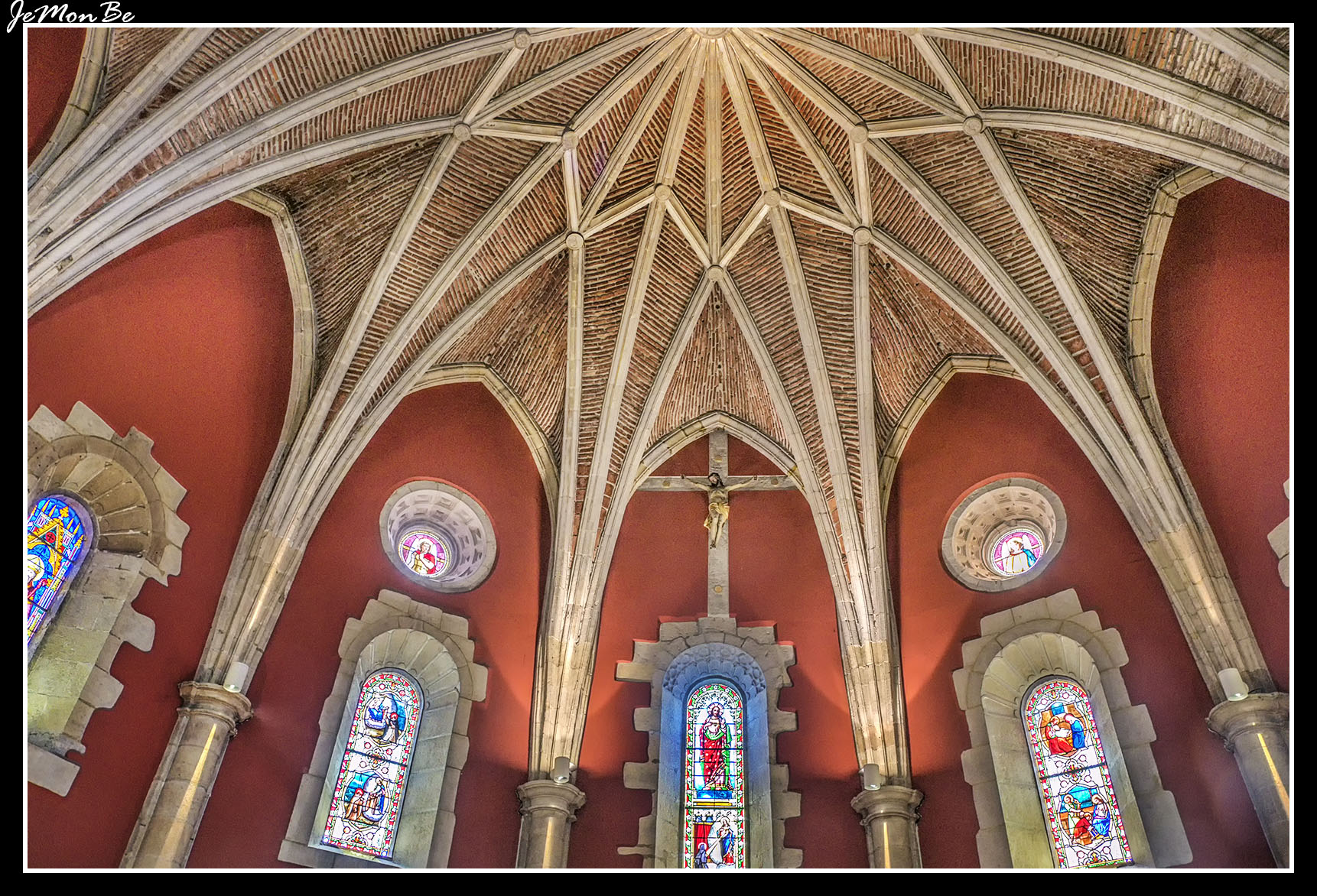 El campanario tiene una altura de 45m y en su fachada presenta un cuadrante solar con la inscripción siguiente en latín: “Vulnerant omnes, ultima necat” que puede traducirse como “todas las horas hieren, la última mata”. El interior de la iglesia es el típico de las iglesias del País Vasco con sus tres pisos de galerías a los que por tradición sólo los hombres podían acceder.