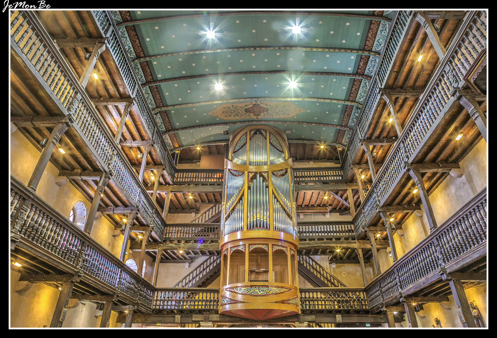 El campanario tiene una altura de 45m y en su fachada presenta un cuadrante solar con la inscripción siguiente en latín: “Vulnerant omnes, ultima necat” que puede traducirse como “todas las horas hieren, la última mata”. El interior de la iglesia es el típico de las iglesias del País Vasco con sus tres pisos de galerías a los que por tradición sólo los hombres podían acceder.