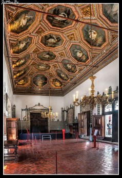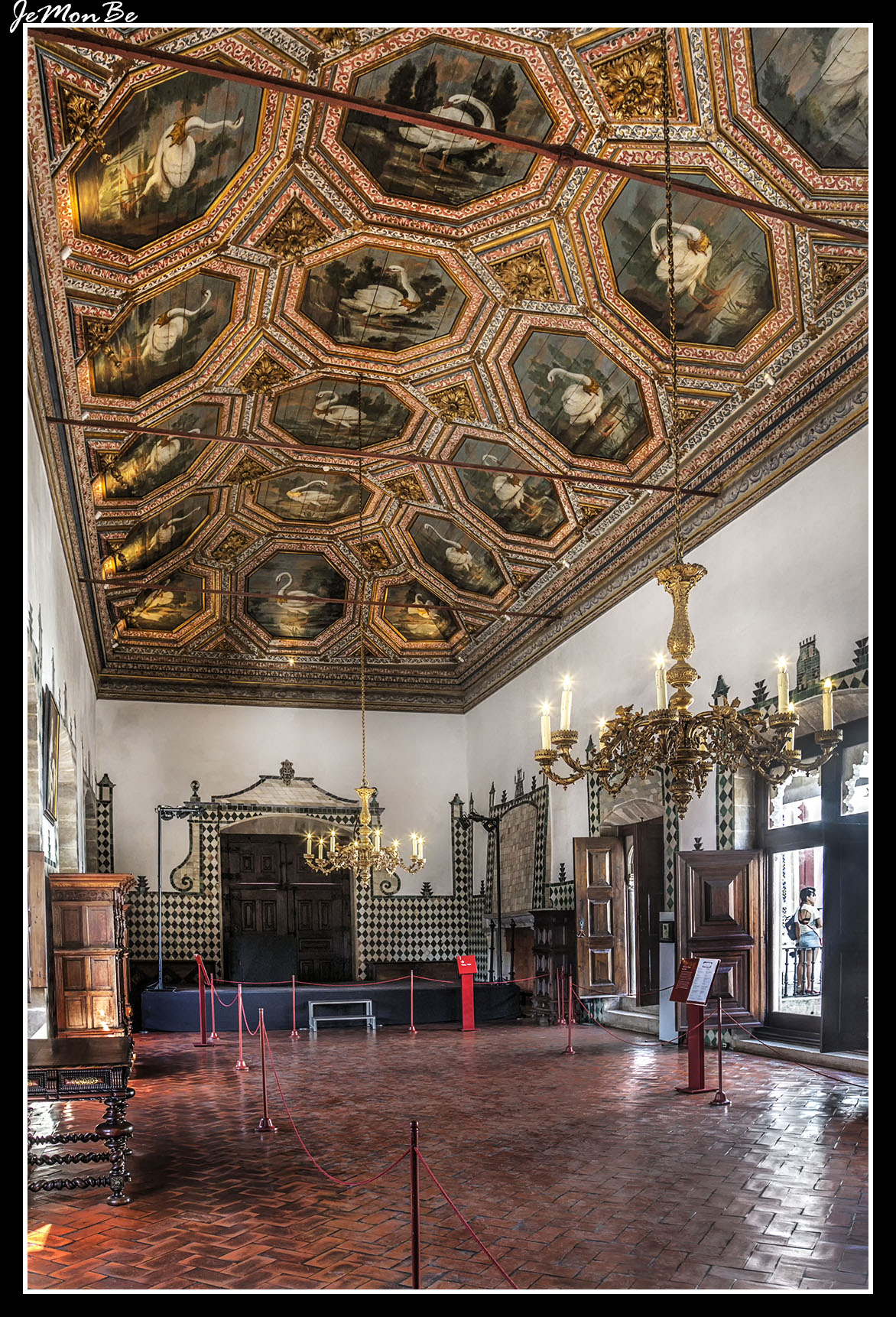 Imagen anterior Imagen siguiente Palacio Nacional de Sintra Sala de los Cisnes. Su nombre se debe a las pinturas renacentistas del techo, compuesto por 27 artesones de madera, decorados con cisnes blancos en diferentes posiciones.