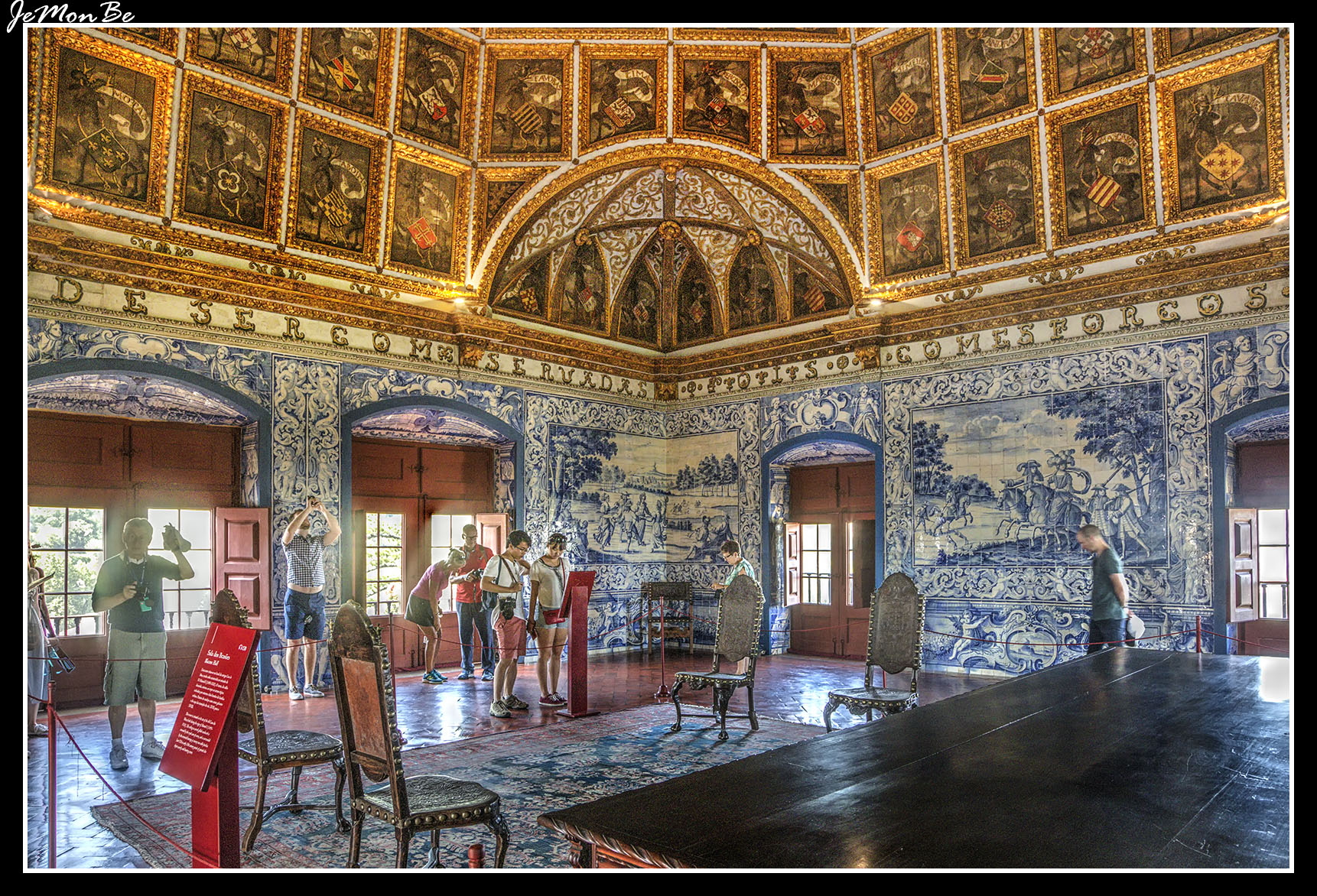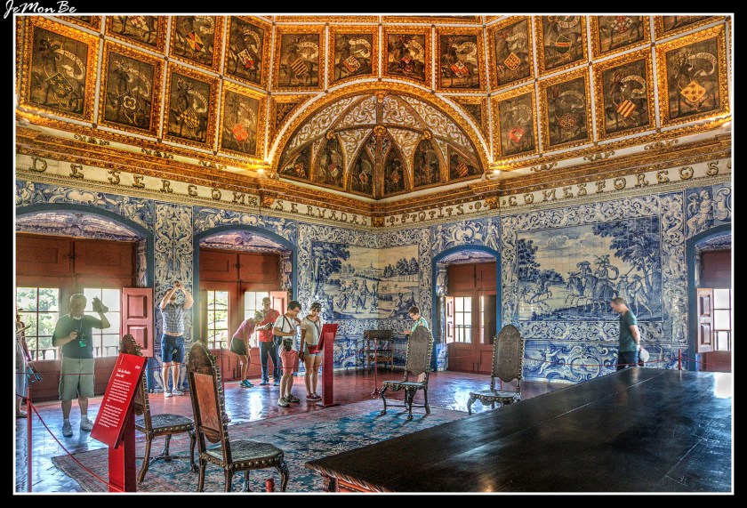 Imagen anterior Imagen siguiente Palacio Nacional de Sintra La Sala de los Blasones es la más importnte sala herádica europea, alegoría del poder central de Manuel I. Los paneles de azulejo muestran escenas bucólicas y de caza.