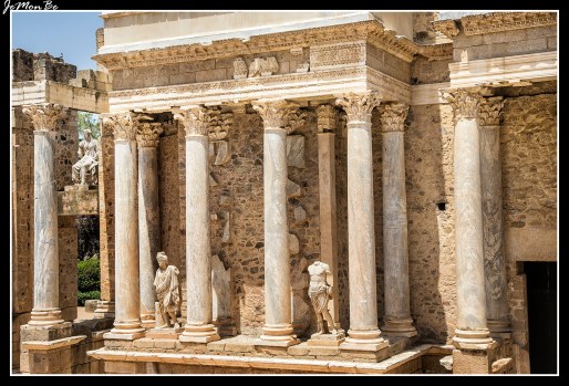 La zona más espectacular del teatro es el frente de la escena, con dos cuerpos de columnas de mármol. Entre ellas, una serie de esculturas completaba la decoración: Ceres, Plutón, Proserpina y estatuas, con togas unas y con corazas otras, que se han interpretado como retratos imperiales.