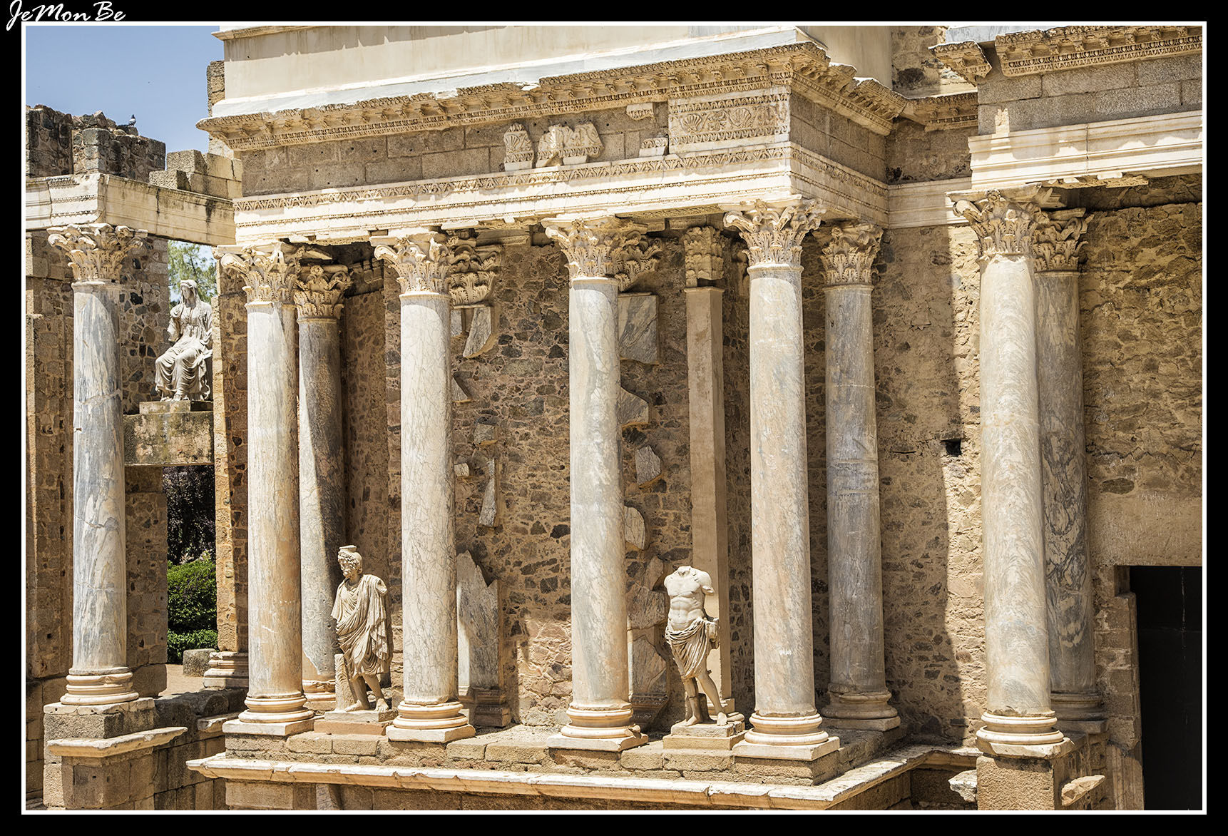La zona más espectacular del teatro es el frente de la escena, con dos cuerpos de columnas de mármol. Entre ellas, una serie de esculturas completaba la decoración: Ceres, Plutón, Proserpina y estatuas, con togas unas y con corazas otras, que se han interpretado como retratos imperiales.