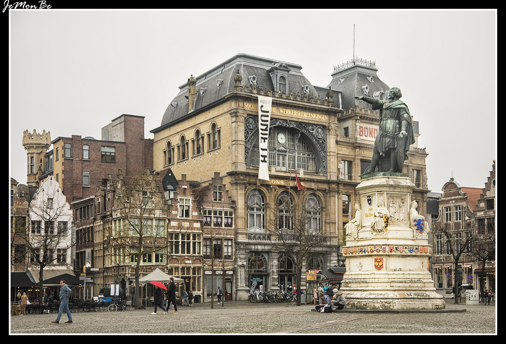 Imagen anterior Imagen siguiente 16 Vrijdagmarkt Ahí está Artevelde, señalando con el brazo hacia Inglaterra desde el centro de la plaza Vrijdagmarkt.
