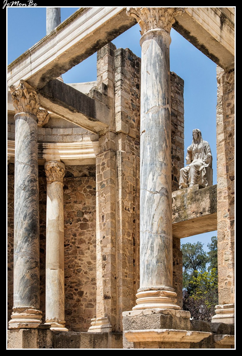 La zona más espectacular del teatro es el frente de la escena, con dos cuerpos de columnas de mármol. Entre ellas, una serie de esculturas completaba la decoración: Ceres, Plutón, Proserpina y estatuas, con togas unas y con corazas otras, que se han interpretado como retratos imperiales.