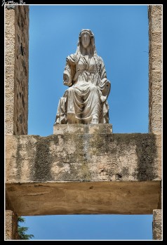 La zona más espectacular del teatro es el frente de la escena, con dos cuerpos de columnas de mármol. Entre ellas, una serie de esculturas completaba la decoración: Ceres, Plutón, Proserpina y estatuas, con togas unas y con corazas otras, que se han interpretado como retratos imperiales.