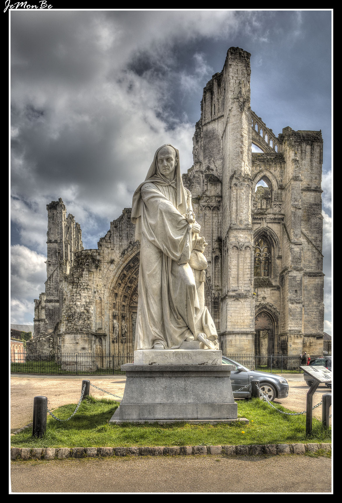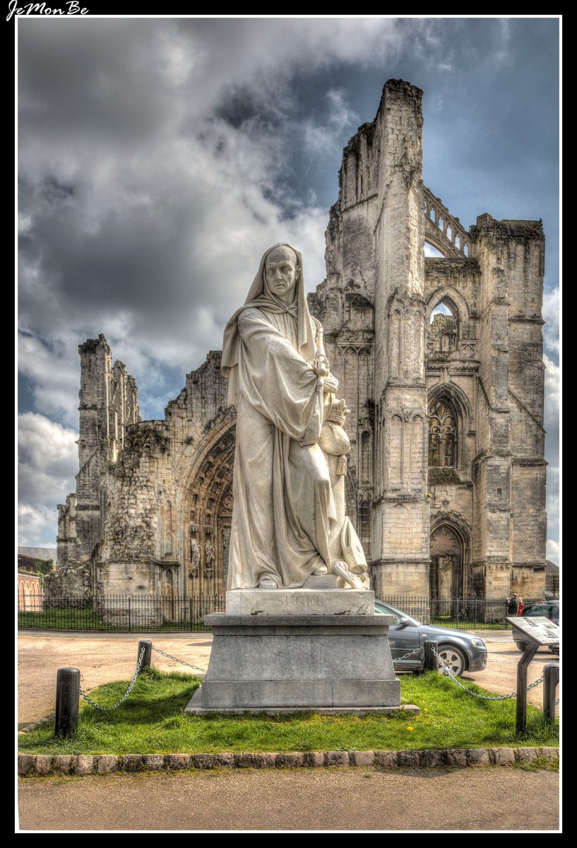 Las ruinas de la abadía de Saint-Bertin y la estatua del abad Suger. El abad Suger fue un personaje decisivo en el desarrollo del arte gótico. Según él, la contemplación de la belleza material permite elevarse al conocimiento de Dios. Con este pensamiento justificó las grandes obras arquitectónicas características de la arquitectura gótica.