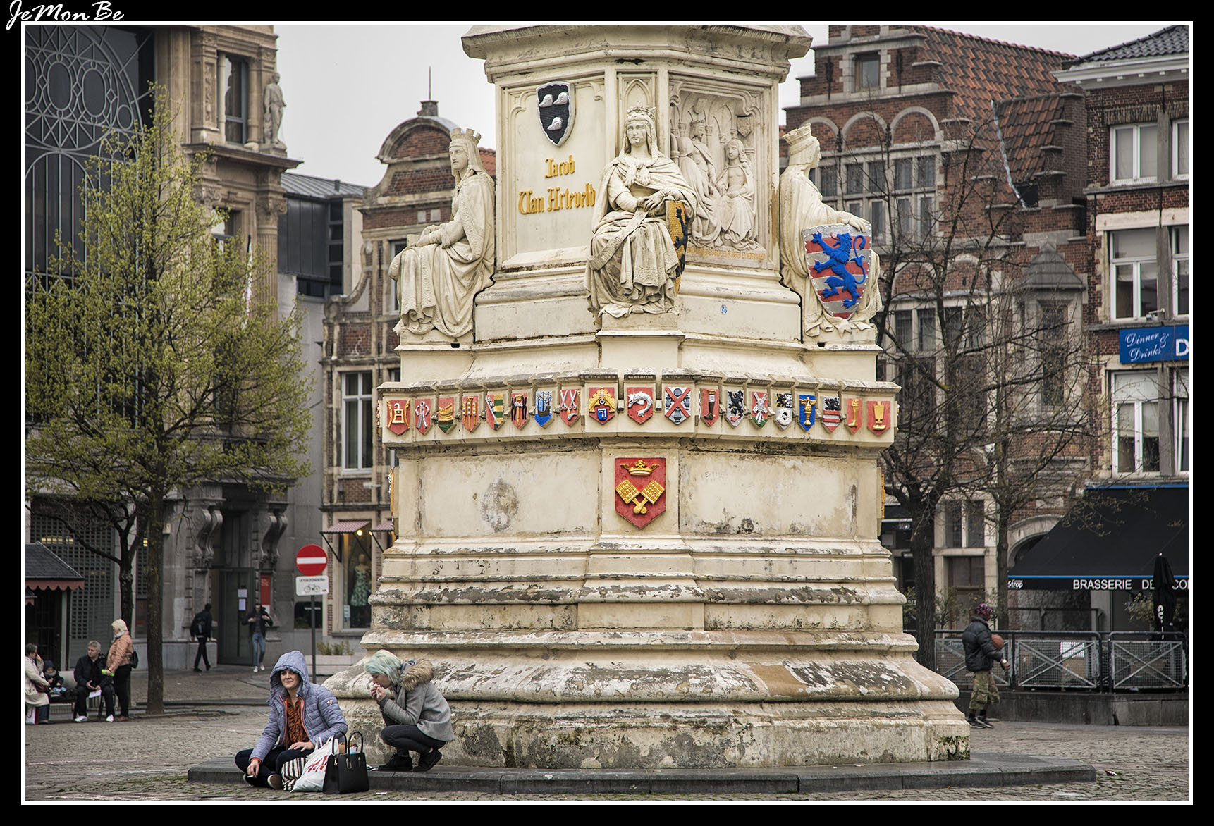 Imagen anterior Imagen siguiente 18 Vrijdagmarkt Ahí está Artevelde, señalando con el brazo hacia Inglaterra desde el centro de la plaza Vrijdagmarkt.