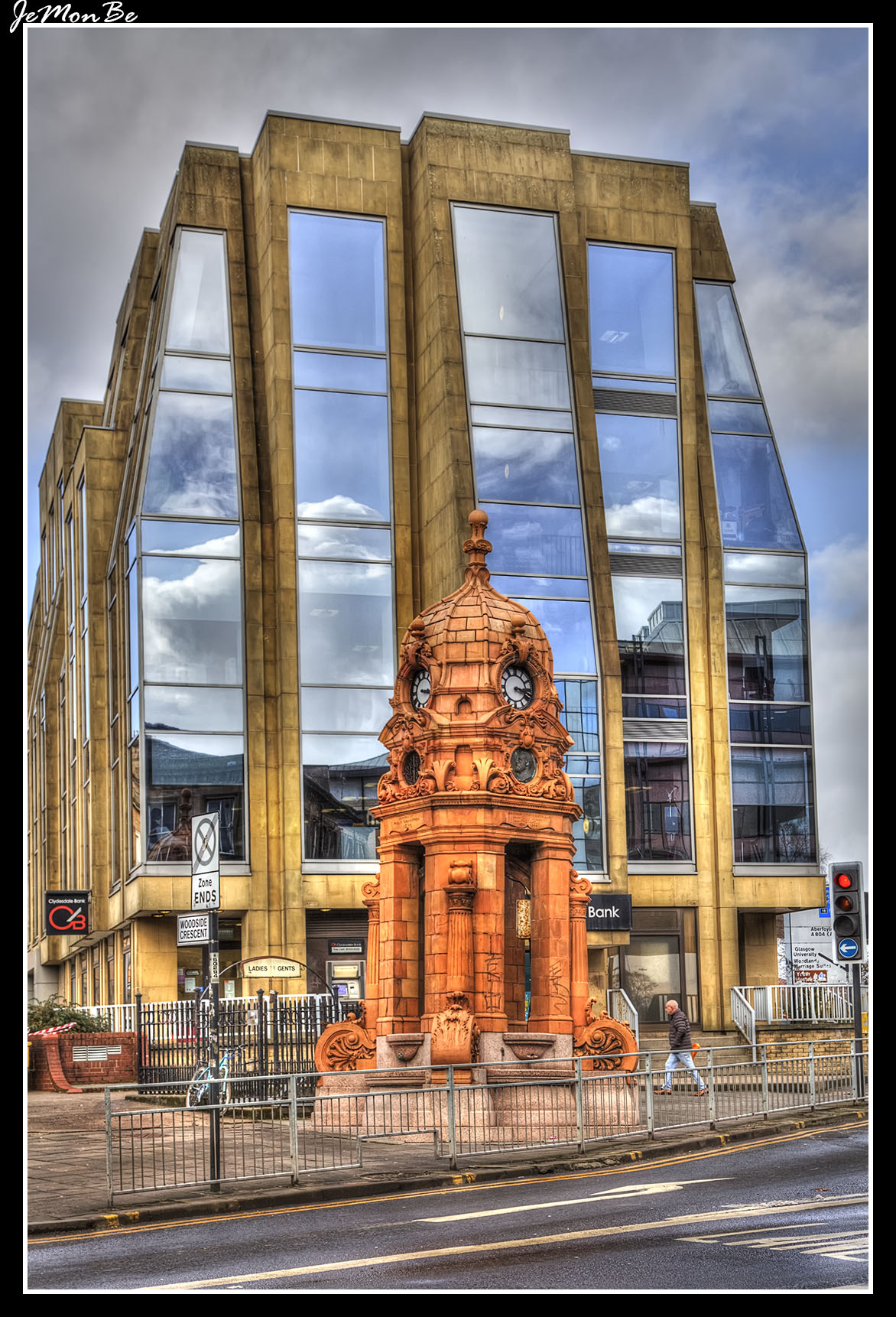 Una estructura de terracota amarilla que combina las funciones duales de fuente para beber y torre con reloj, incorporando dos medallones de retrato de bronce idénticos de Sir Charles Cameron.