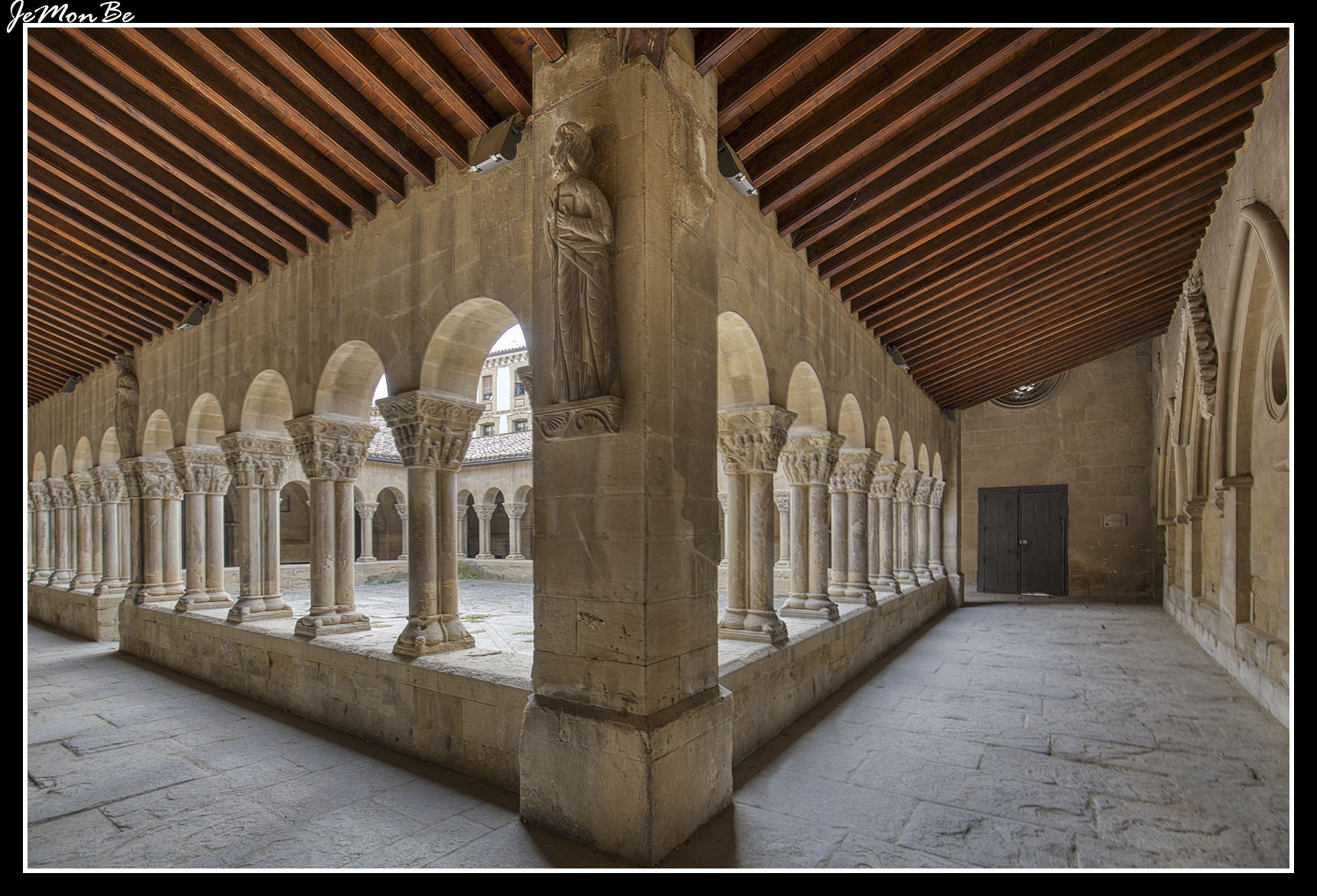 Su claustro rectangular está formado por arcos de medio punto y columnas dobles con 38 elaborados capiteles que representan la vida de Jesús, así como otras escenas de carácter alegórico e histórico. Este claustro tiene en su lado este varias capillas