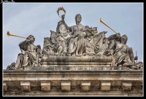Tiene dos fachadas diferentes, un pasillo con techo abovedado y una parte central con figuras mitológicas, columnas de estilo dórico y diferentes esculturas (Marte y Hércules), entre otros elementos.