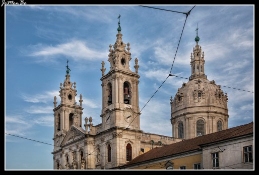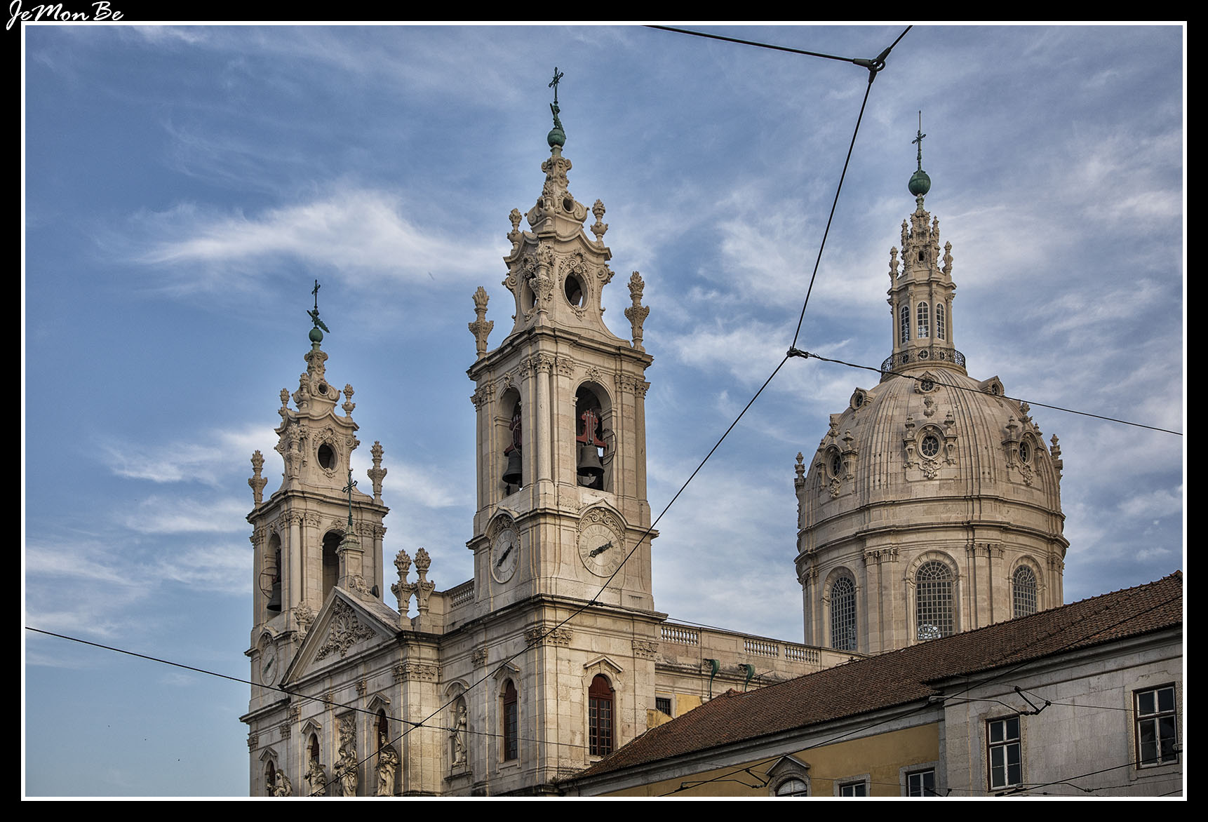 La enorme cúpula, es visible desde casi cualquier punto de la ciudad. La Basílica fue construida por arquitectos de la Escuela de Mafra, en estilo Barroco final y Neoclásico. La fachada está enmarcada por dos torres gemelas y decorada con estatuas de santos y figuras alegóricas.