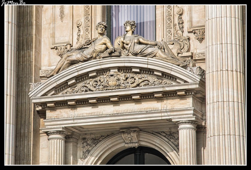 El estilo Neorenacentista ,se caracteriza por el uso de elementos de la arquitectura clásica como las columnas corintias o el frontón que se pueden observar en esta construcción. Su monumental escalera está flanqueada por dos grandes leones, uno que alza la cabeza hacia el cielo – simbolizando las subidas del mercado de valores – y el otro que la agacha hacia abajo – señalando las consecuentes caídas de la bolsa -. Las cariátides de la entrada que representan la Protección, el Comercio, las Artes y la Victoria, también están firmadas por el estudio escultórico en el que trabajó Rodin. Toda esta majestuosidad buscaba deleitar a los hombres de negocios burgueses de aquella época.
