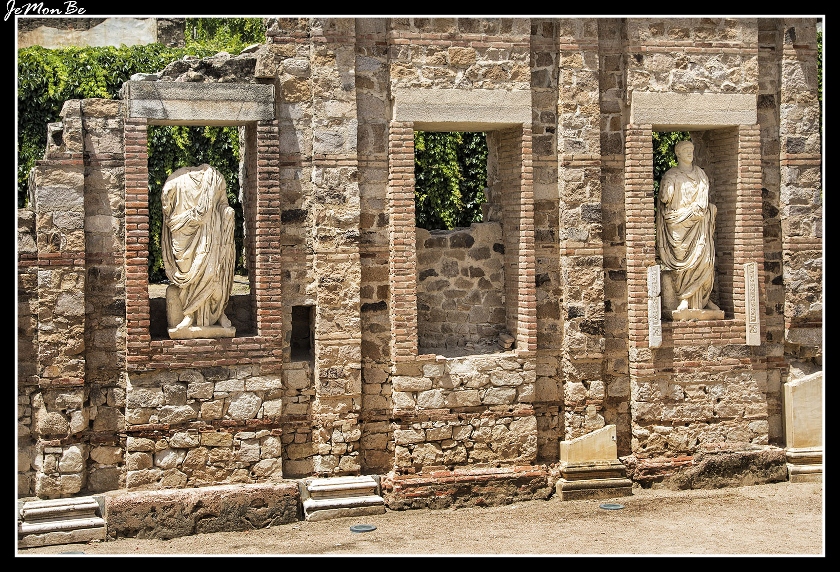 La zona más espectacular del teatro es el frente de la escena, con dos cuerpos de columnas de mármol. Entre ellas, una serie de esculturas completaba la decoración: Ceres, Plutón, Proserpina y estatuas, con togas unas y con corazas otras, que se han interpretado como retratos imperiales.