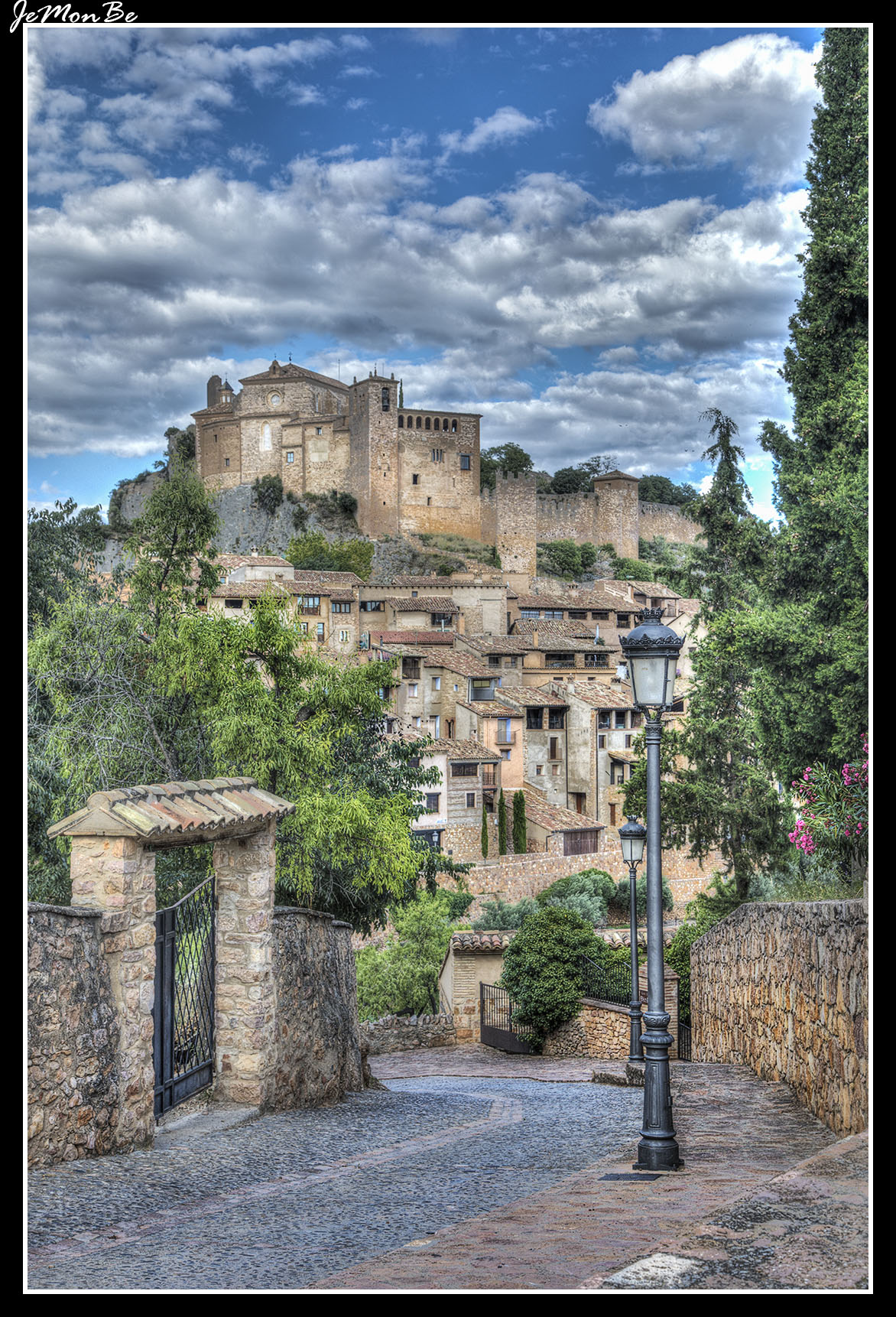 La panorámica del castillo-colegiata coronando el cerro frente al pueblo y rodeado de profundos barrancos, es inolvidable. Adelantada, la torre albarrana y a su derecha, adosada a la muralla de la que forma parte, vemos la torre-esconjuradero.