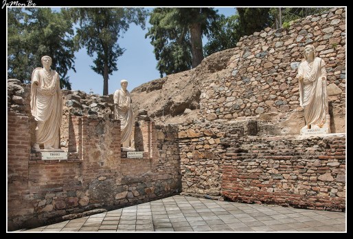 La zona más espectacular del teatro es el frente de la escena, con dos cuerpos de columnas de mármol. Entre ellas, una serie de esculturas completaba la decoración: Ceres, Plutón, Proserpina y estatuas, con togas unas y con corazas otras, que se han interpretado como retratos imperiales.