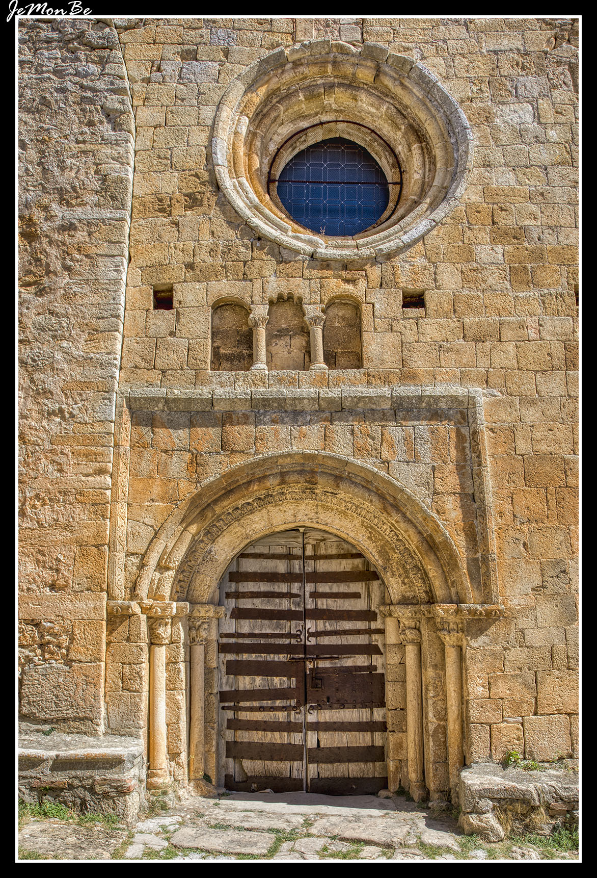 Fue restaurada en estilo gótico, conserva de su etapa románica la portada. Ésta tiene tres arquivoltas ligeramente apuntadas, que se apoyan sobre capiteles decorados con motivos animales. La puerta esta enmarcada por un alfiz. Encima de la portada hay tres vanos cegados, el arco del central es lobulado y sobre ellos un óculo.