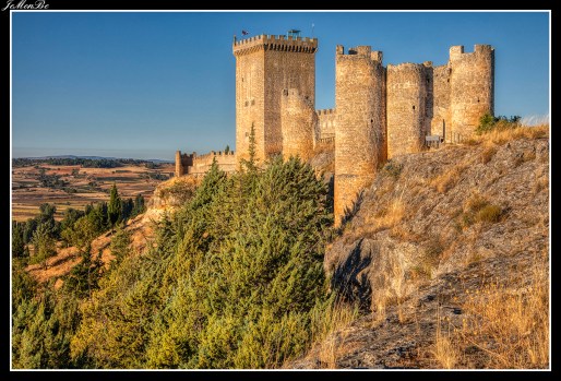 El castillo de Peñaranda de Duero es una gran fortaleza que domina de forma clara el caserío, su construcción se atribuye al primer conde de Miranda, entre mediados y finales del siglo XV. Presenta una gran similitud con otros castillos de la comarca ribereña, como los de Peñafiel y Gormaz, y también repite el ventajoso emplazamiento entre un monte y un río, como se observa en Burgos, Frías o Castrojeriz. Su planta alargada y quebrada se adapta de forma perfecta al escarpado roquedo sobre el que se asienta, la famosa Peña de Aranda, ocupando aproximadamente la mitad occidental de la misma. La puerta de acceso se halla al Este, separada del resto por un foso excavado en la roca viva. En el conjunto fortificado, destaca la céntrica y sólida torre del homenaje, de finales del siglo XV. Consta de planta baja y tres pisos.