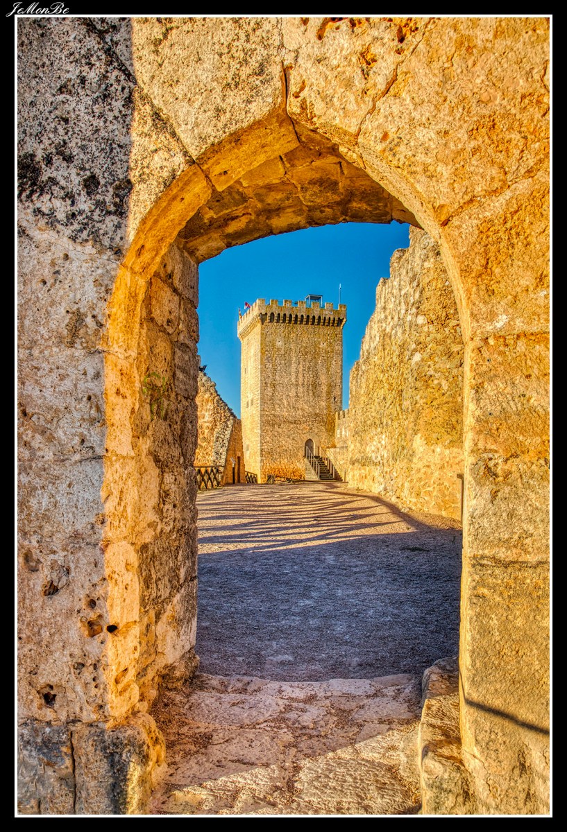 El castillo de Peñaranda de Duero es una gran fortaleza que domina de forma clara el caserío, su construcción se atribuye al primer conde de Miranda, entre mediados y finales del siglo XV. Presenta una gran similitud con otros castillos de la comarca ribereña, como los de Peñafiel y Gormaz, y también repite el ventajoso emplazamiento entre un monte y un río, como se observa en Burgos, Frías o Castrojeriz. Su planta alargada y quebrada se adapta de forma perfecta al escarpado roquedo sobre el que se asienta, la famosa Peña de Aranda, ocupando aproximadamente la mitad occidental de la misma. La puerta de acceso se halla al Este, separada del resto por un foso excavado en la roca viva. En el conjunto fortificado, destaca la céntrica y sólida torre del homenaje, de finales del siglo XV. Consta de planta baja y tres pisos.
