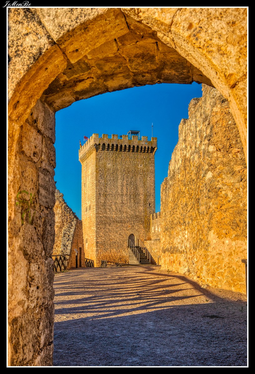 El castillo de Peñaranda de Duero es una gran fortaleza que domina de forma clara el caserío, su construcción se atribuye al primer conde de Miranda, entre mediados y finales del siglo XV. Presenta una gran similitud con otros castillos de la comarca ribereña, como los de Peñafiel y Gormaz, y también repite el ventajoso emplazamiento entre un monte y un río, como se observa en Burgos, Frías o Castrojeriz. Su planta alargada y quebrada se adapta de forma perfecta al escarpado roquedo sobre el que se asienta, la famosa Peña de Aranda, ocupando aproximadamente la mitad occidental de la misma. La puerta de acceso se halla al Este, separada del resto por un foso excavado en la roca viva. En el conjunto fortificado, destaca la céntrica y sólida torre del homenaje, de finales del siglo XV. Consta de planta baja y tres pisos.