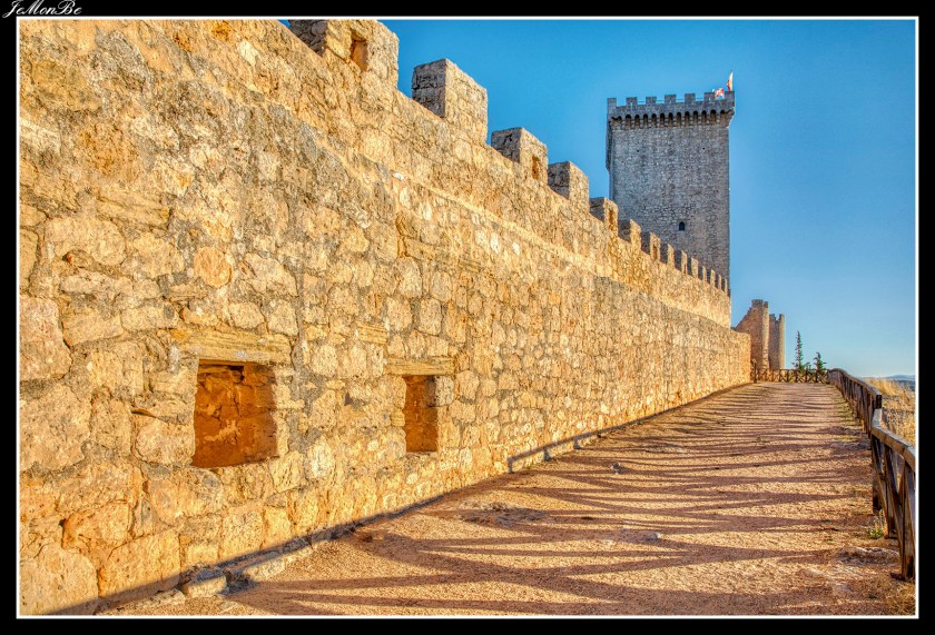 El castillo de Peñaranda de Duero es una gran fortaleza que domina de forma clara el caserío, su construcción se atribuye al primer conde de Miranda, entre mediados y finales del siglo XV. Presenta una gran similitud con otros castillos de la comarca ribereña, como los de Peñafiel y Gormaz, y también repite el ventajoso emplazamiento entre un monte y un río, como se observa en Burgos, Frías o Castrojeriz. Su planta alargada y quebrada se adapta de forma perfecta al escarpado roquedo sobre el que se asienta, la famosa Peña de Aranda, ocupando aproximadamente la mitad occidental de la misma. La puerta de acceso se halla al Este, separada del resto por un foso excavado en la roca viva. En el conjunto fortificado, destaca la céntrica y sólida torre del homenaje, de finales del siglo XV. Consta de planta baja y tres pisos.