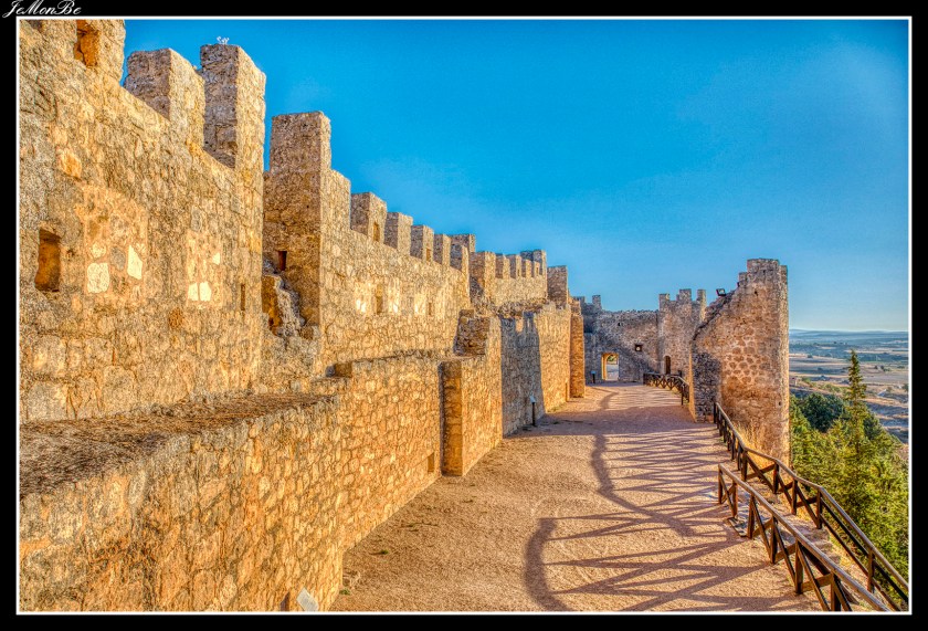 El castillo de Peñaranda de Duero es una gran fortaleza que domina de forma clara el caserío, su construcción se atribuye al primer conde de Miranda, entre mediados y finales del siglo XV. Presenta una gran similitud con otros castillos de la comarca ribereña, como los de Peñafiel y Gormaz, y también repite el ventajoso emplazamiento entre un monte y un río, como se observa en Burgos, Frías o Castrojeriz. Su planta alargada y quebrada se adapta de forma perfecta al escarpado roquedo sobre el que se asienta, la famosa Peña de Aranda, ocupando aproximadamente la mitad occidental de la misma. La puerta de acceso se halla al Este, separada del resto por un foso excavado en la roca viva. En el conjunto fortificado, destaca la céntrica y sólida torre del homenaje, de finales del siglo XV. Consta de planta baja y tres pisos.