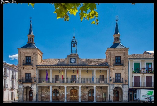 La Casa Consistorial reproduce el esquema estructural del hospital con humildad y sencillez. En el cuerpo central dos plantas de galería adintelada, la inferior con columnas toscanas procedentes del Ayuntamiento medieval. Las torres de tres cuerpos y los remates de las mismas con chapitel sencillo y en el centro reloj, campanillo y veleta quieren emular la hornacina de San Agustín del hospital frontero.