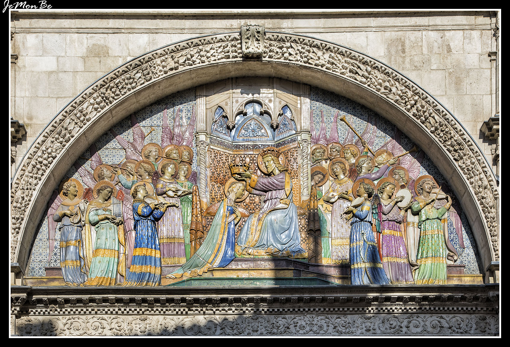 En el tímpano del pórtico se puede contemplar una reproducción en cerámica de Gaston Virebent que representa la coronación de la Virgen de Fray Angélico que data de 1874.