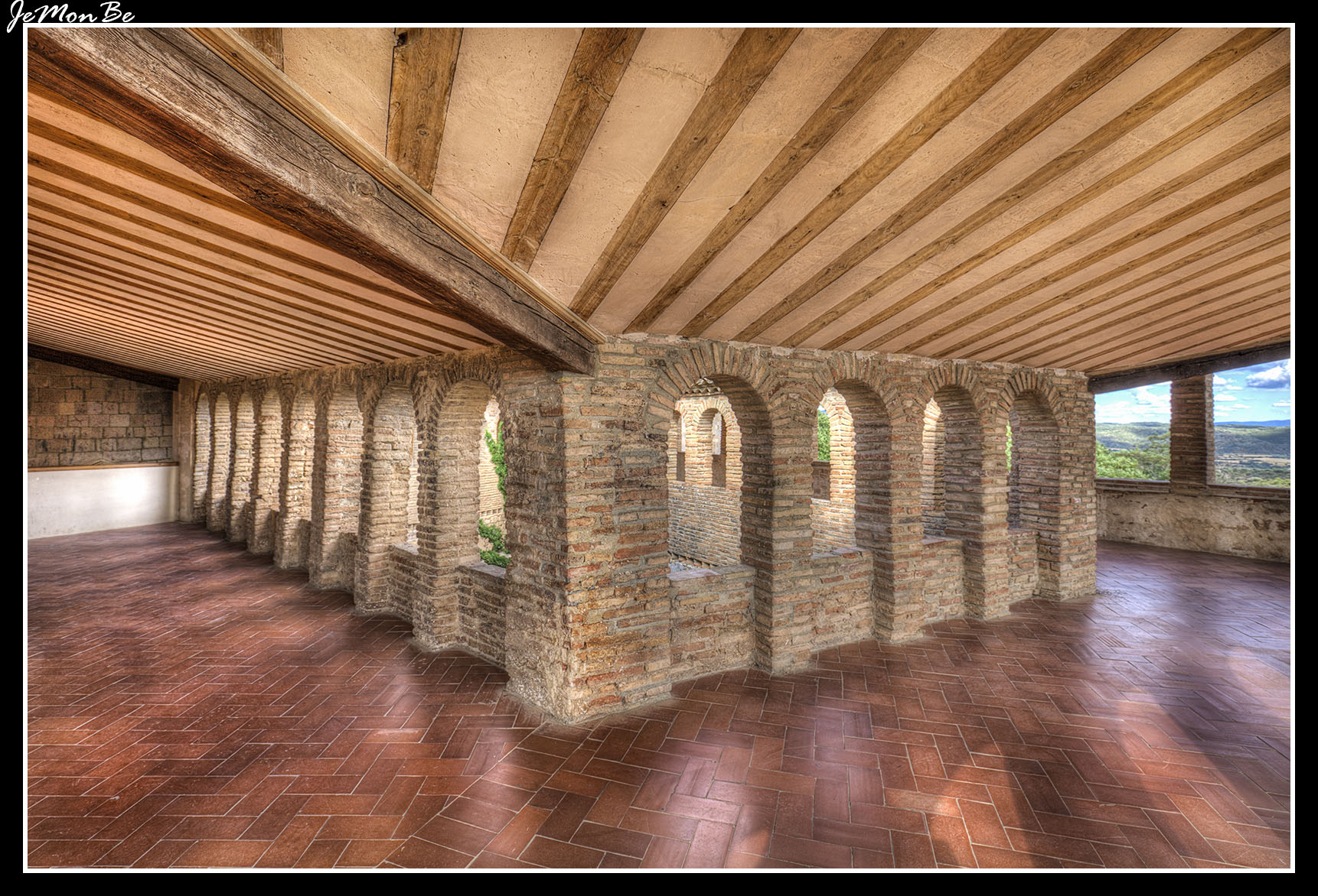 Sobre esta estructura descrita, separada por friso de esquinillas, se superpone un segundo piso en ladrillo, cuajado de vanos rematados en arco de medio punto al estilo de los pisos altos de las casonas nobles aragonesas. Las crujías sureste y sur, dejan ver hileras de vanos al exterior del edificio (en la fachada de acceso al edificio, y en la que da vista al caserío del pueblo).